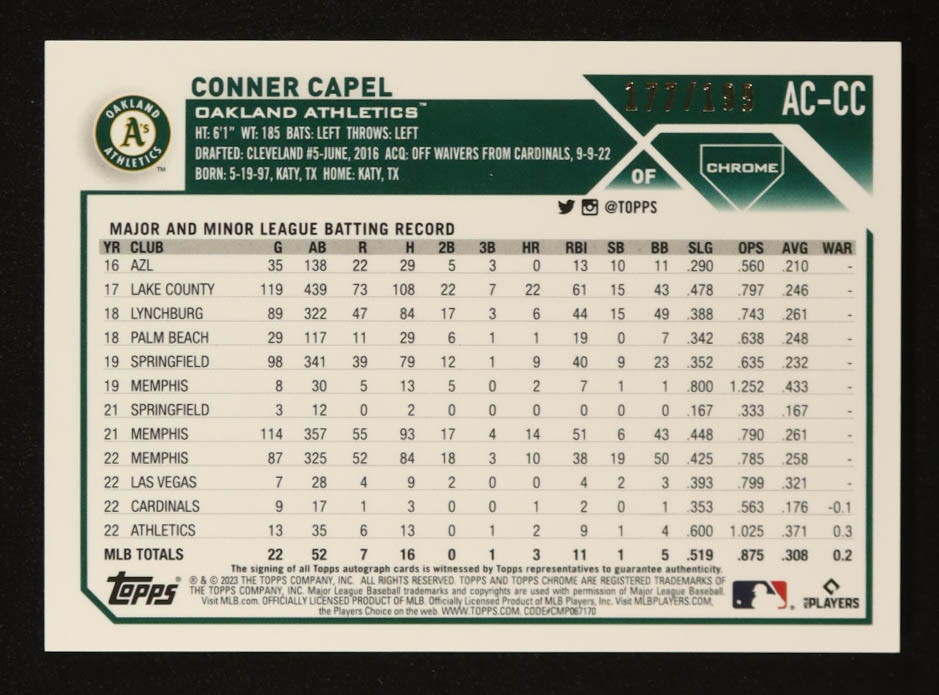 Conner Capel 2023 Topps Chrome Update Autographs Aqua Wave Refractors #ACCC #177/199 RC