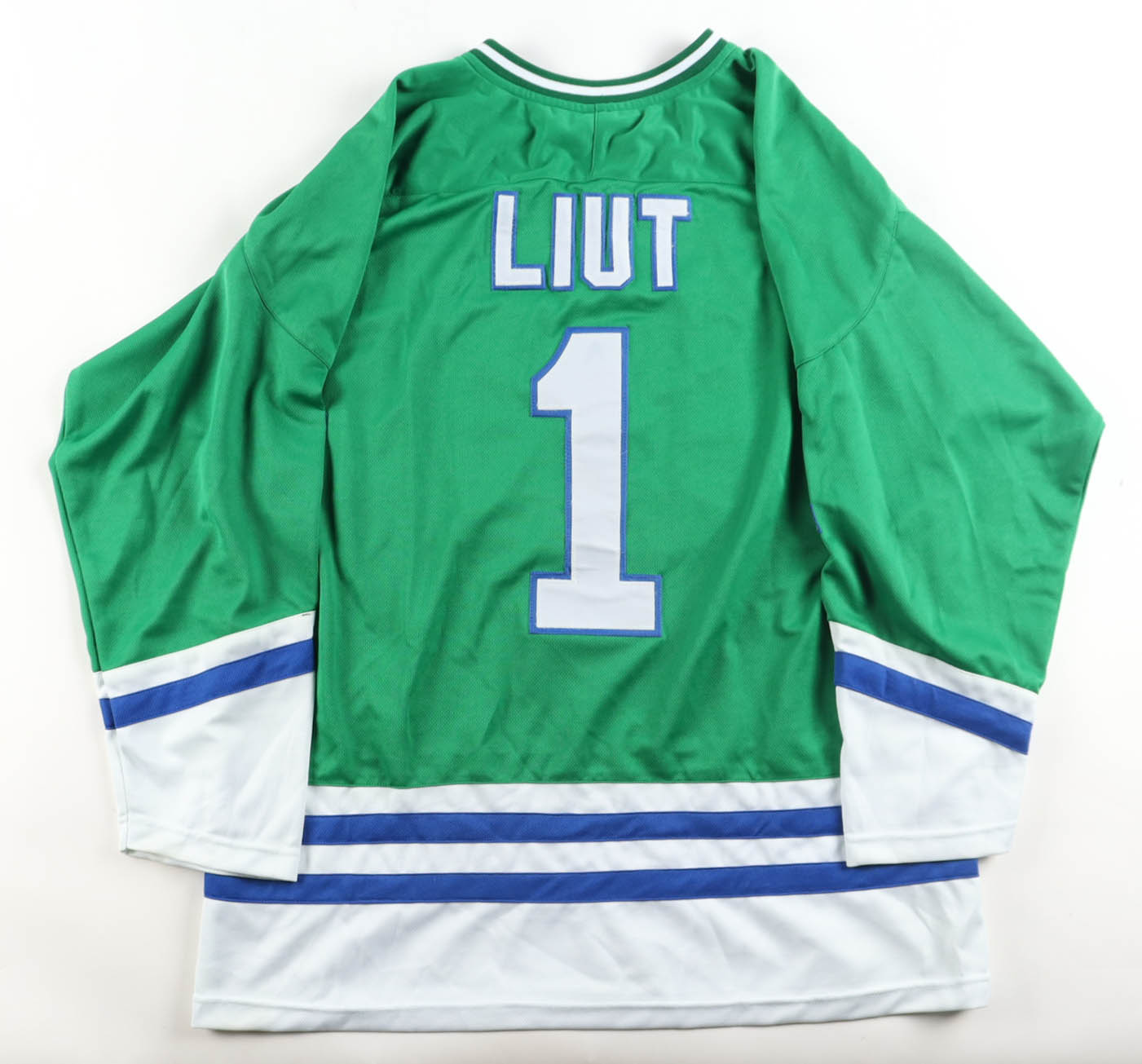 Custom jersey with everything sewn on, size 2XL. Hand-signed by Mike Liut. Please note, the signature has bled.