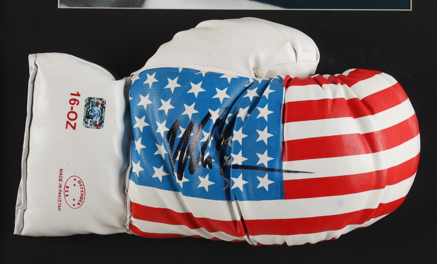 Custom frame measures approximately 17" x 29" in size and and features an 11" x 14" photo and a USA boxing glove that has been hand-signed by Mike Tyson (HOF).