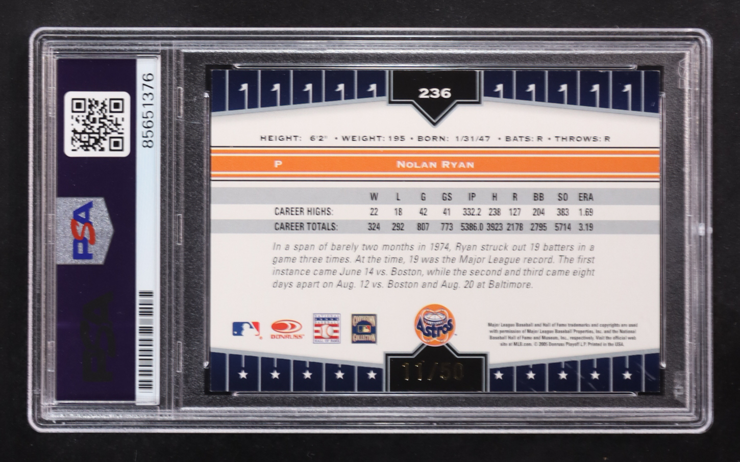 Nolan Ryan Signed 2005 Donruss Champions #236 #11/50 (PSA 10)