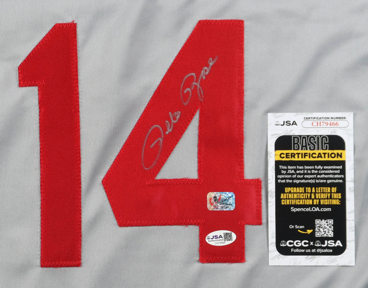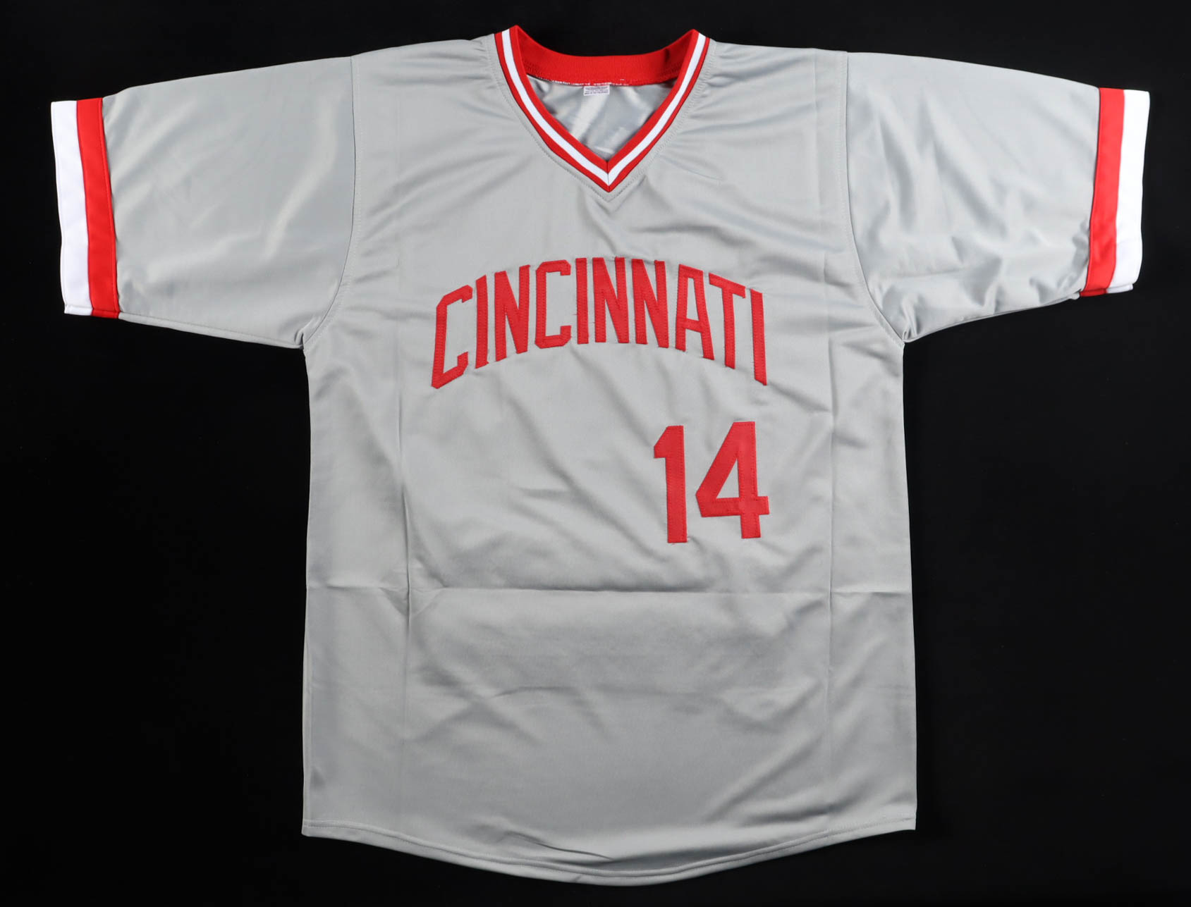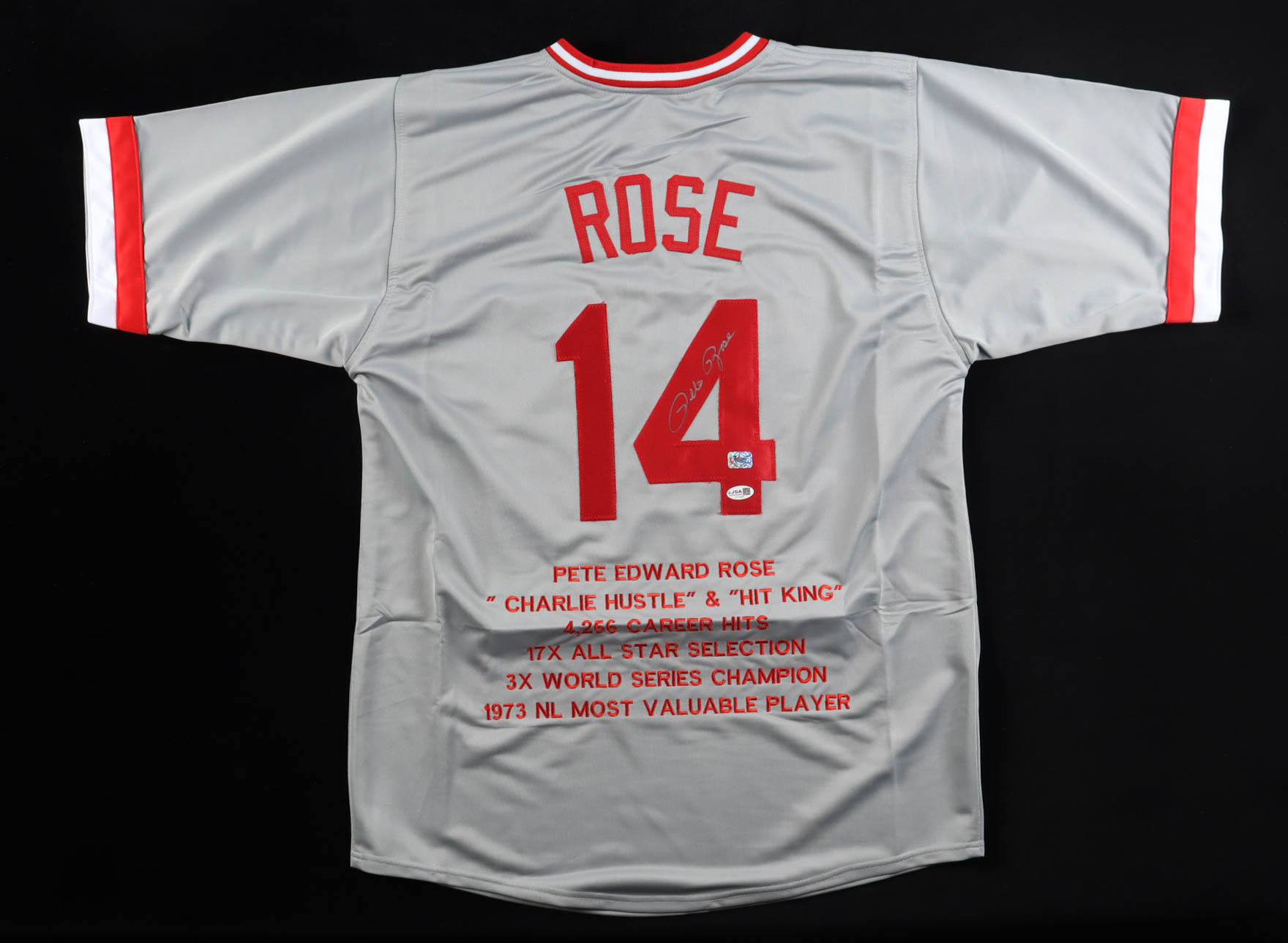 Custom jersey with everything sewn on, size XL. Hand-signed by Pete Rose (D. 2024). Rose's career highlight statistics have been custom-stitched below the reverse numbers.