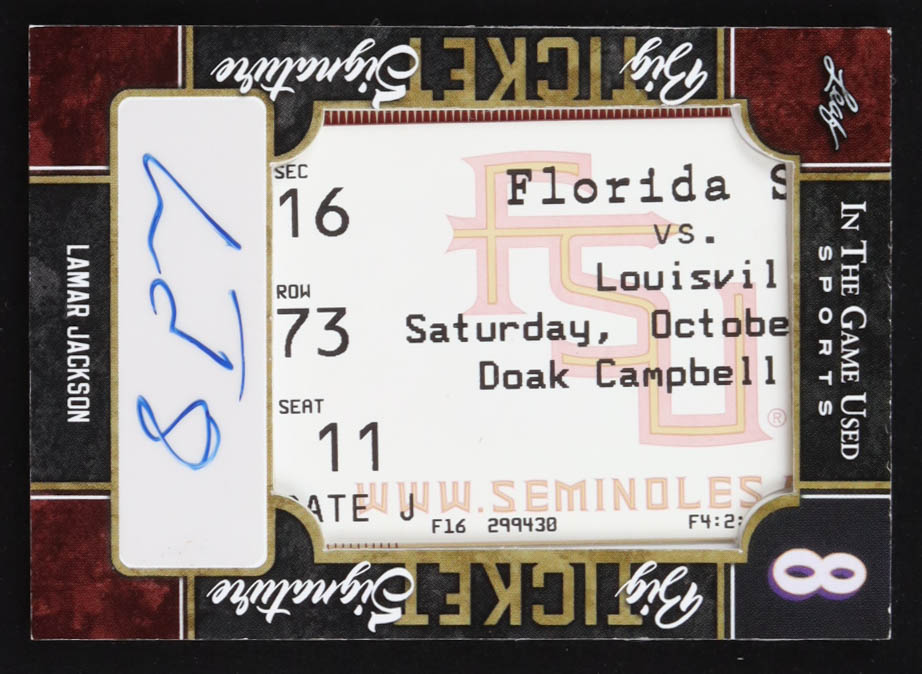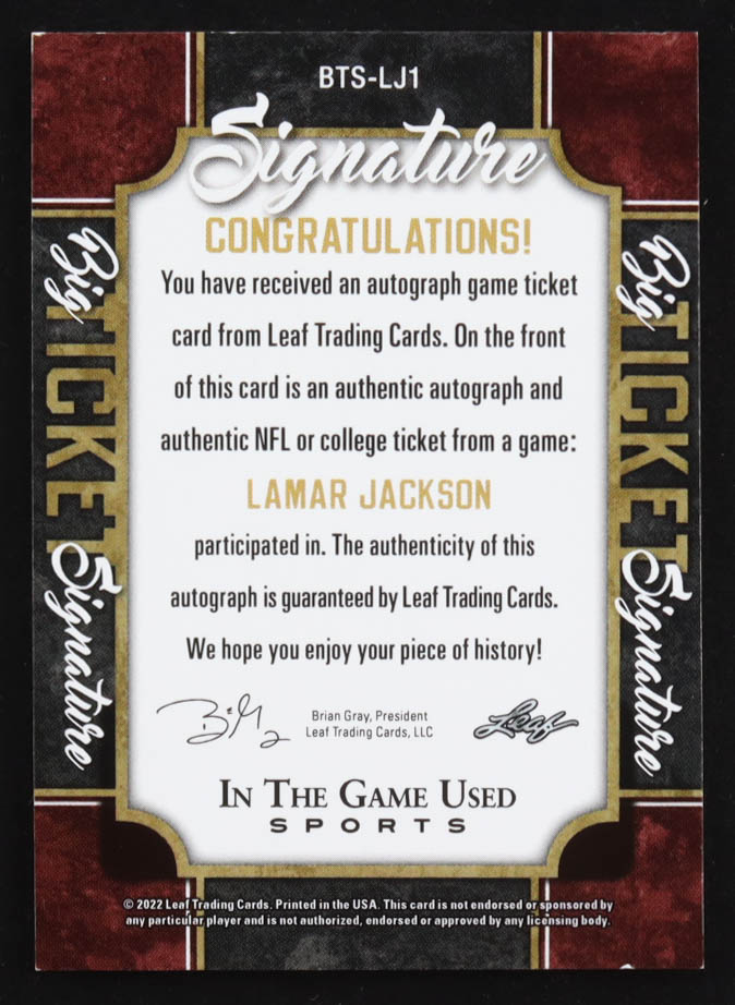 Lamar Jackson 2022 Leaf ITG Used SportsBig Ticket Signature Autograph #BTSLJ1