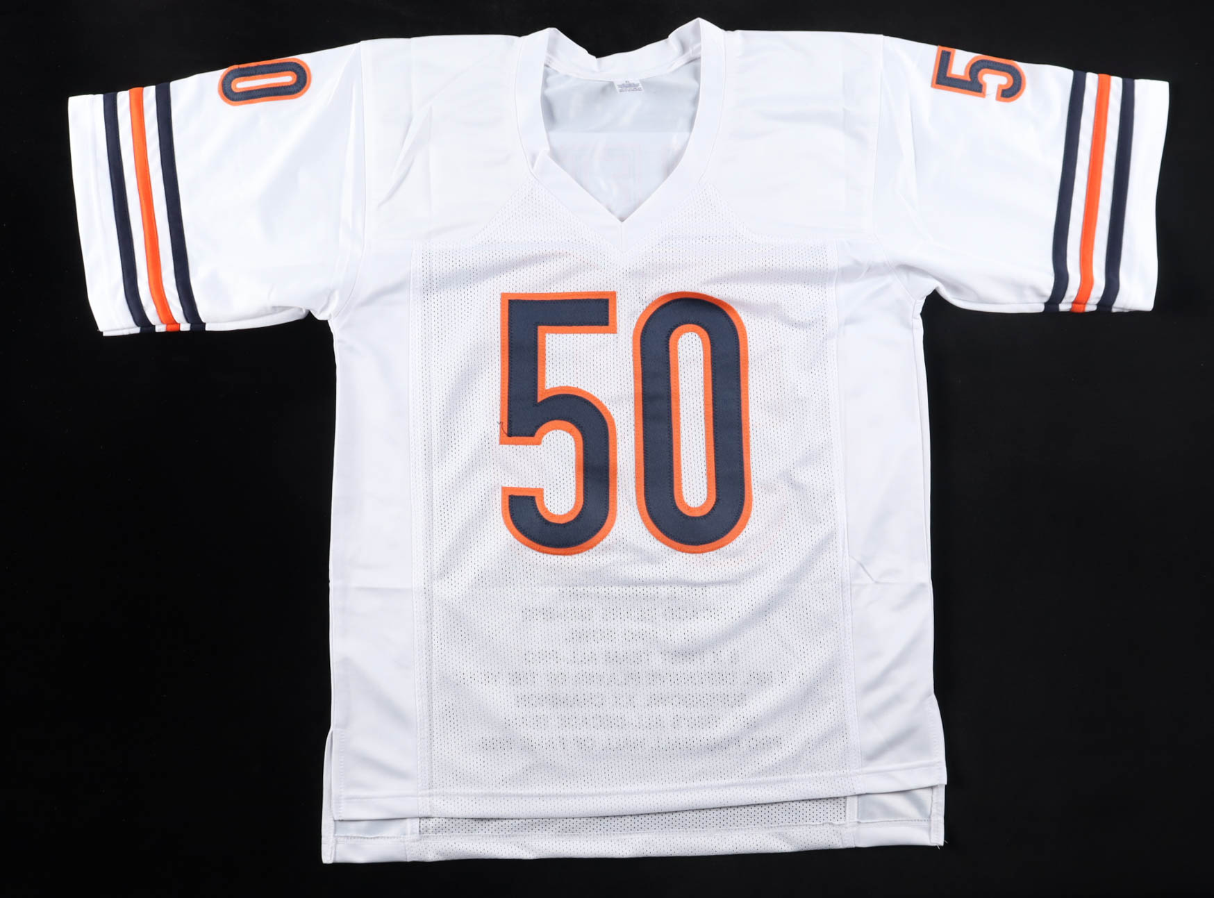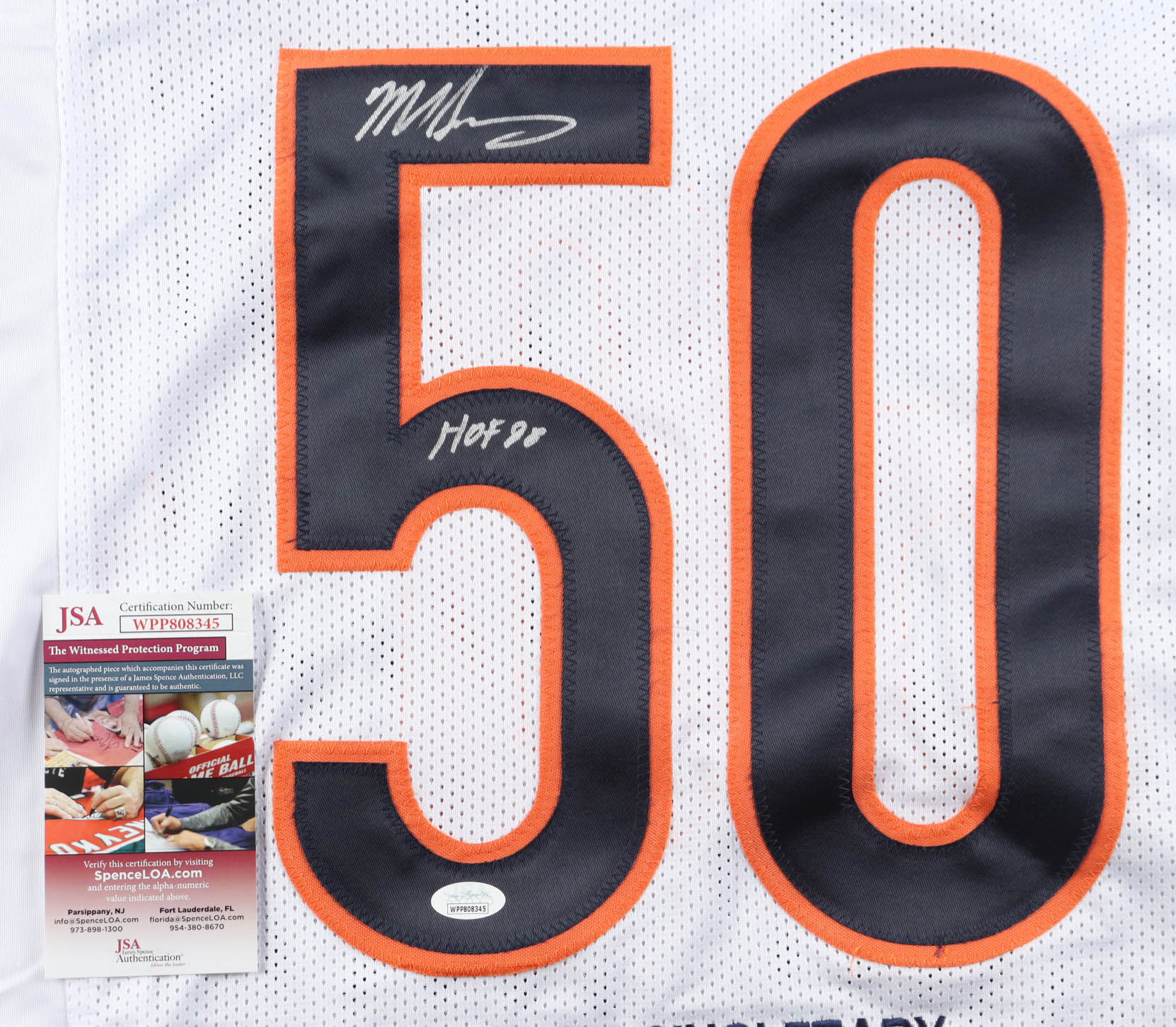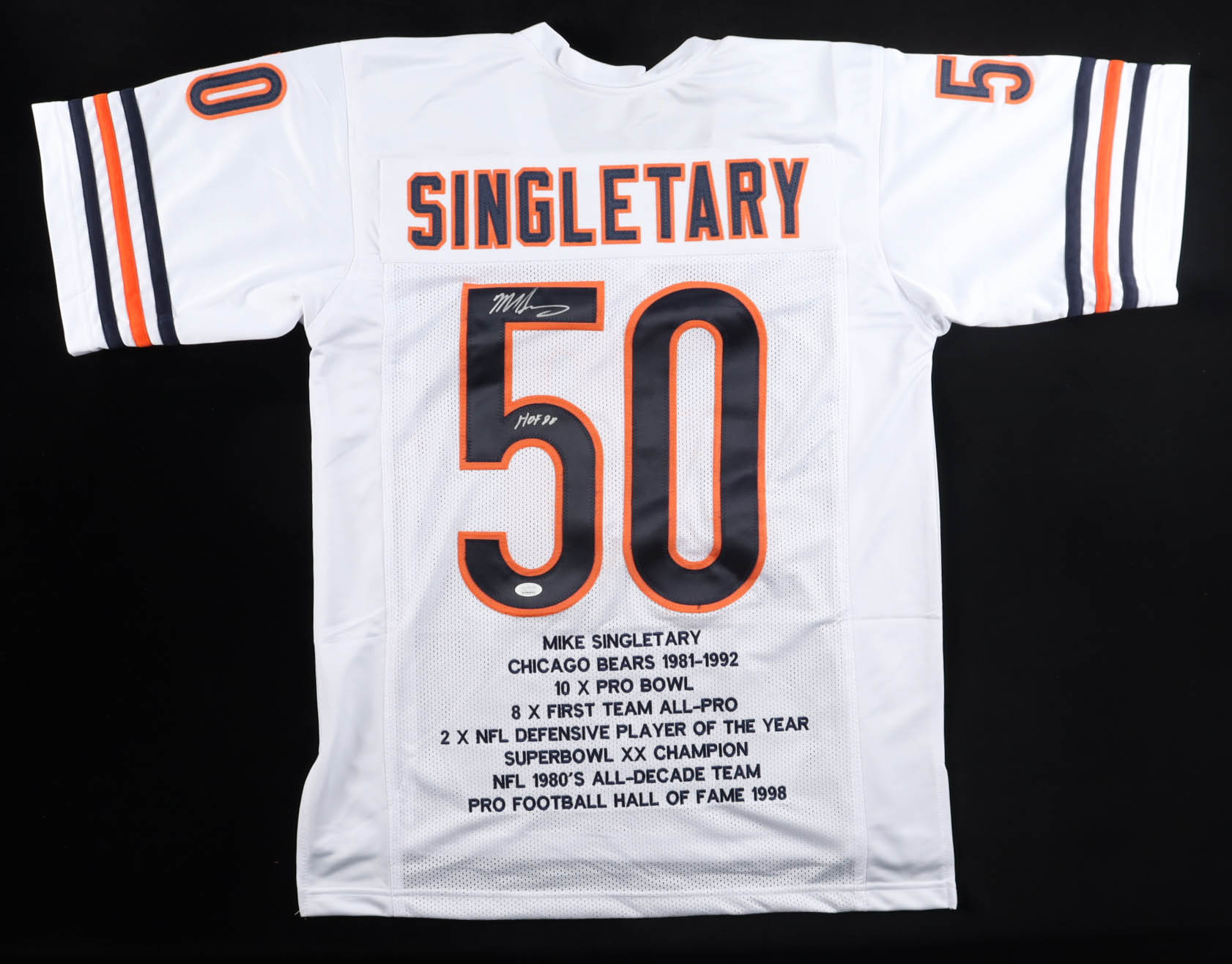 Custom jersey with everything sewn on, size XL. Hand-signed and inscribed by Mike Singletary (HOF). Singletary's career stats have been custom stitched in the jersey below the reverse numbers
