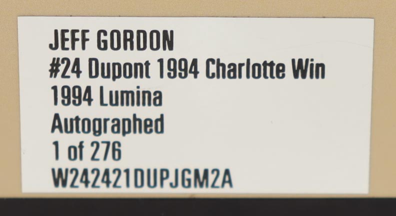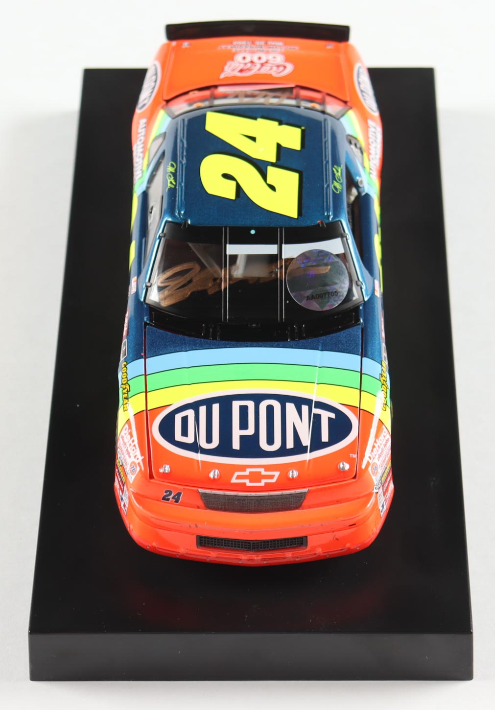Premium die-cast car hand-signed on the windshield by Jeff Gordon (HOF) and on rear window by Ray Evernham (Crew Chief). This die-cast car is limited edition to just 276 produced and comes in the original packaging as shown.