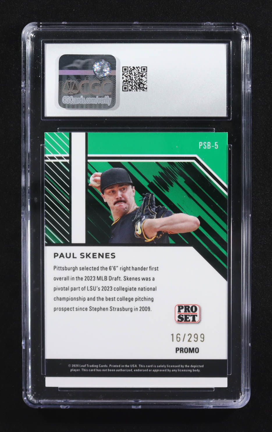 Paul Skenes 2024 Leaf Collective Promos Pro Set Orange Shimmer #PSB-5 RC #16/299 (CGC 10)
