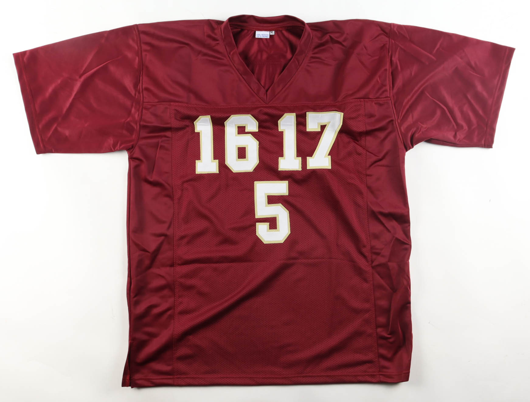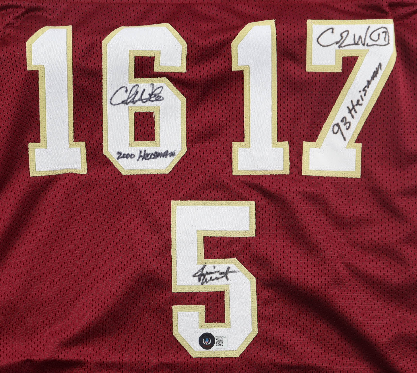 Custom jersey with everything sewn on, size XL. Hand-signed and inscribed by Jameis Winston, Chris Weinke, Charlie Ward.