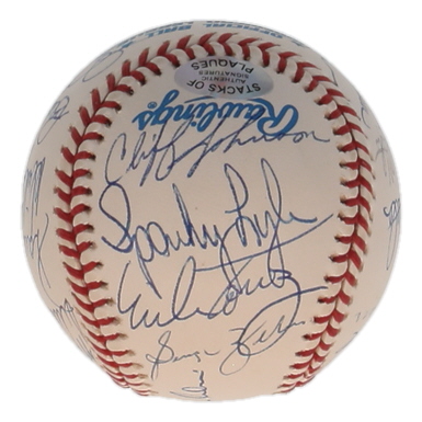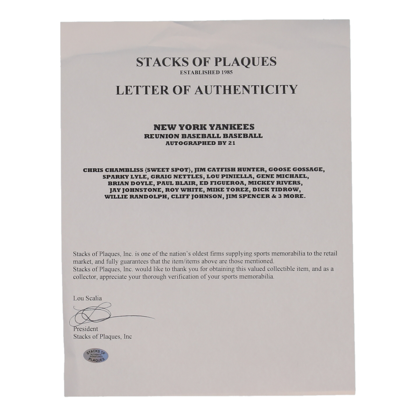 Rawlings Official American League baseball has been hand-signed by (21) New York Hall of Famers and stars including Chris Chambliss, Jim Catfish Hunter, Goose Gossage, Sparky Lyle, Graig Nettles, Lou Piniella, Gene Michael, Brian Doyle, Paul Blair, Ed Figueroa, Mickey Rivers, Jay Johnstone, Roy White, Mike Torez, Dick Tidrow, Willie Randolph, Cliff Johnson, Jim Spencer and (3) others.