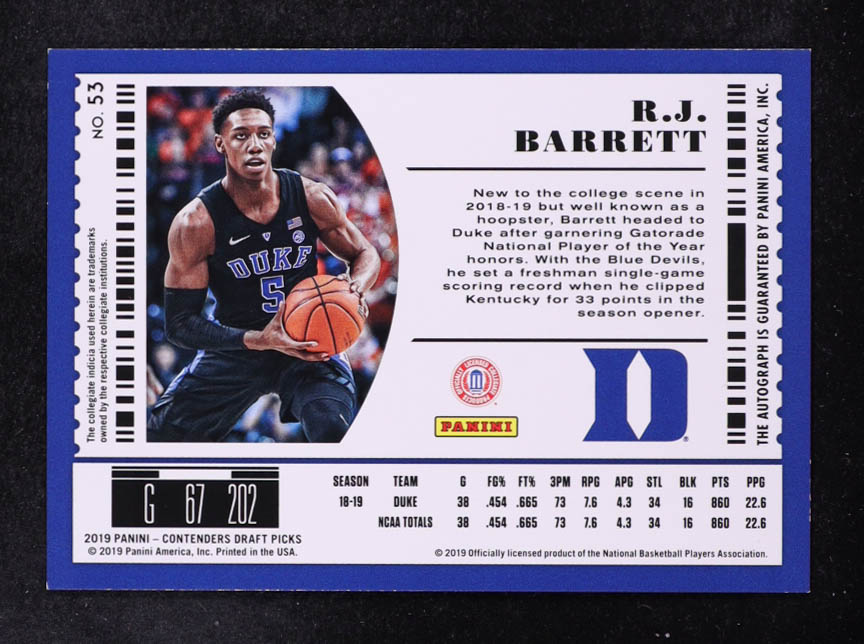RJ Barrett 2019-20 Panini Contenders Draft Picks Draft Ticket Red Foil #53 Autograph RC