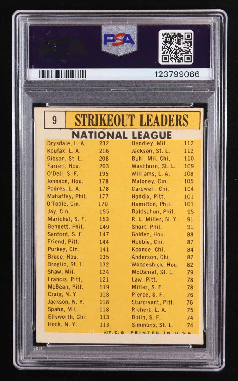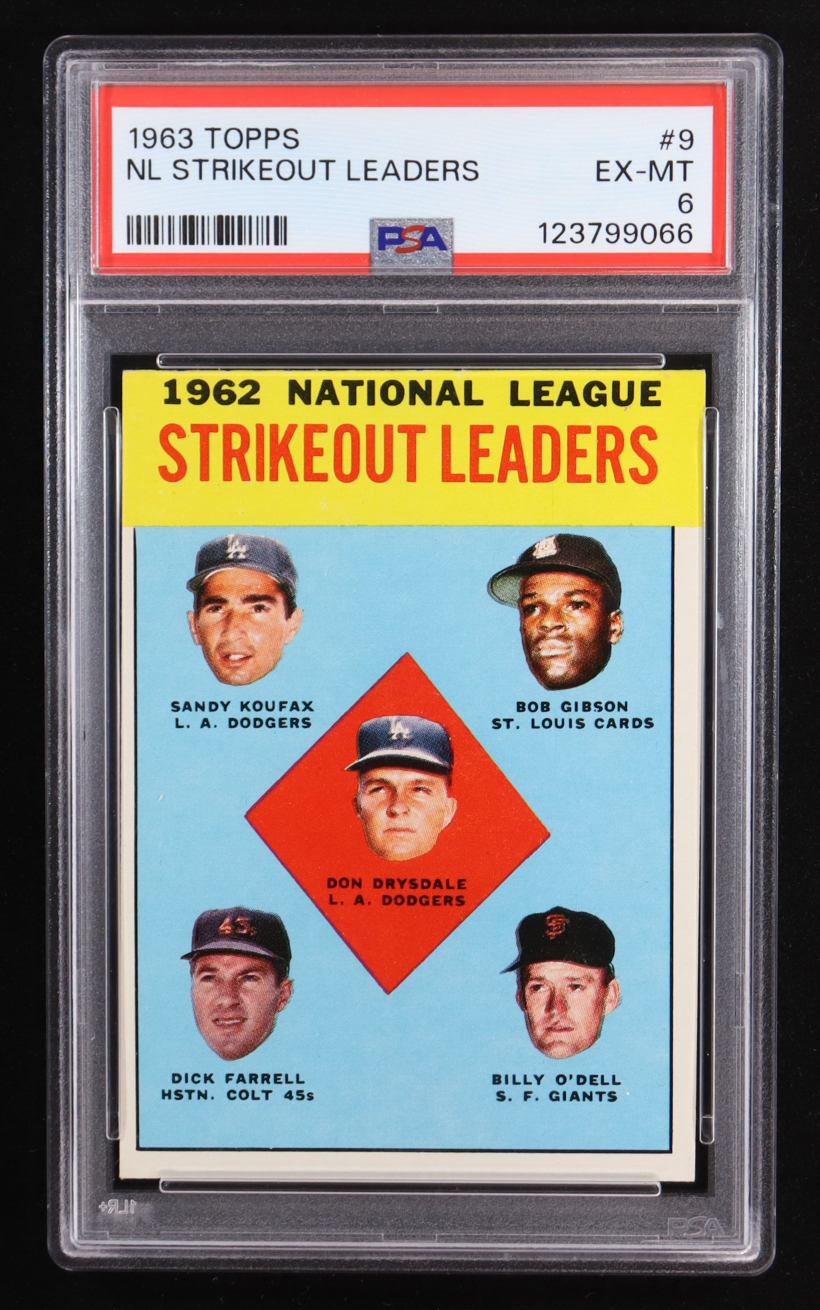 Don Drysdale / Sandy Koufax / Bob Gibson / Billy O'Dell / Dick Farrell 1963 Topps #9 NL Strikeout Leaders (PSA 6)
