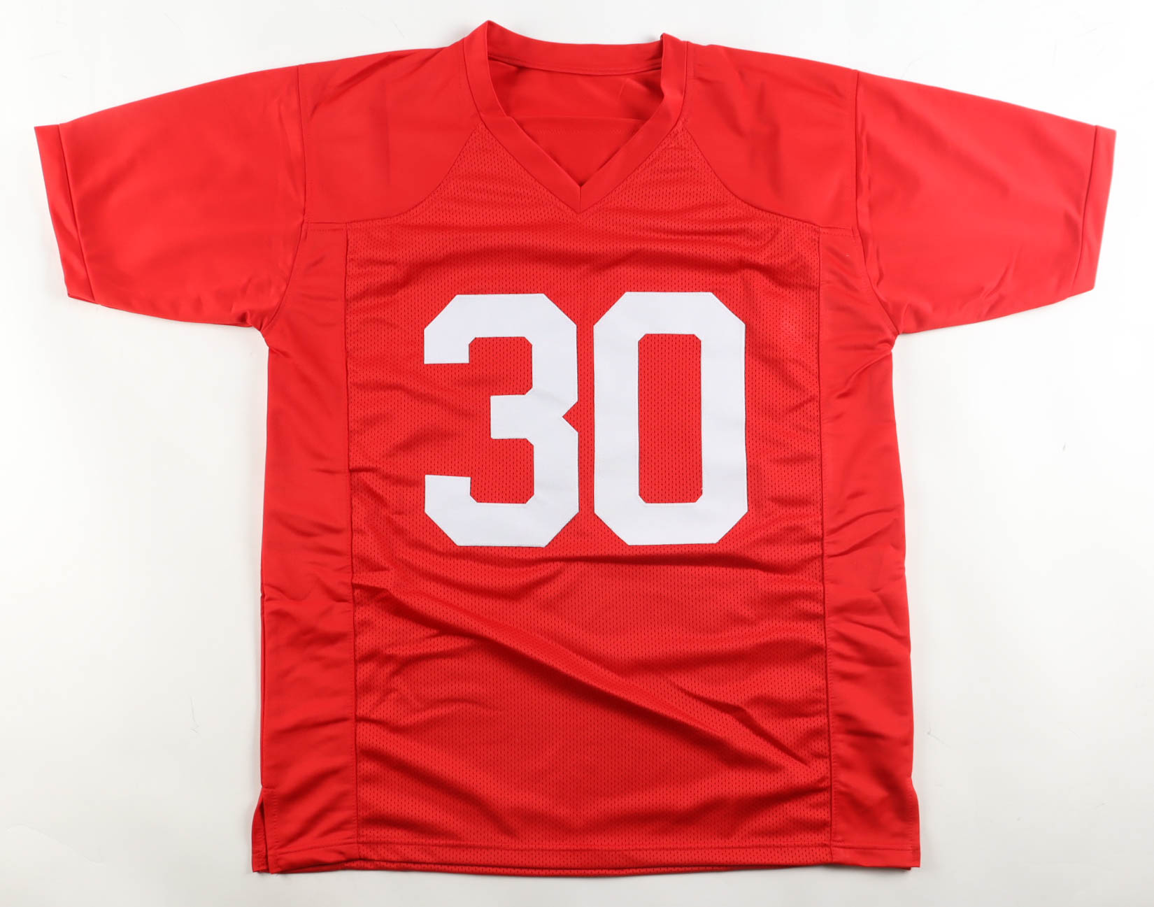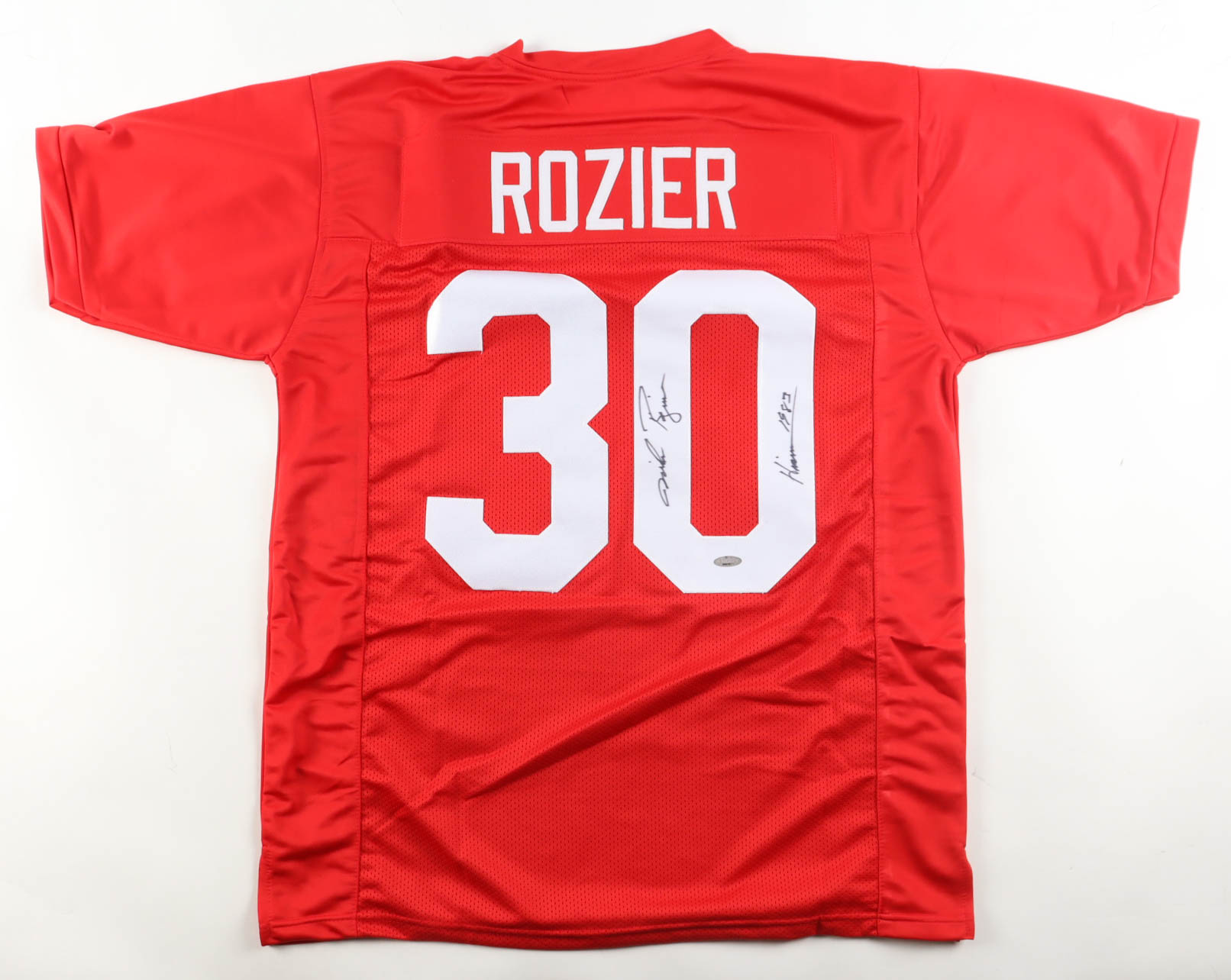 Custom jersey with everything sewn on, size XL. Hand-signed and inscribed by Mike Rozier.