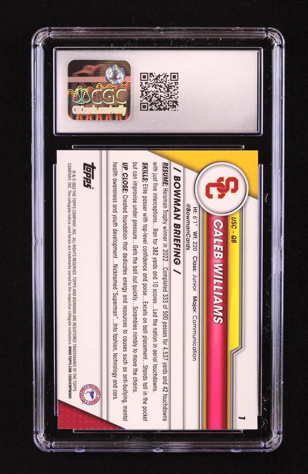 Card has been graded CGC 10. Please see photos for more details regarding the condition of the card (USC Trojans).