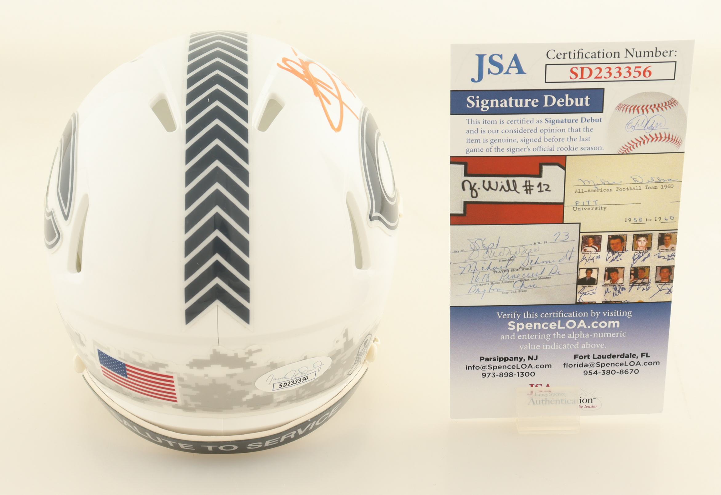 The autograph(s) includes an official James Spence Authentication (JSA) "Signature Debut" hologram and COA. "Signature Debut" is the autographed memorabilia equivalent to a rookie card. The JSA definition of a "Signature Debut" is as follows: "Any item that is autographed and received by JSA prior to the last game of the signer's official rookie season.