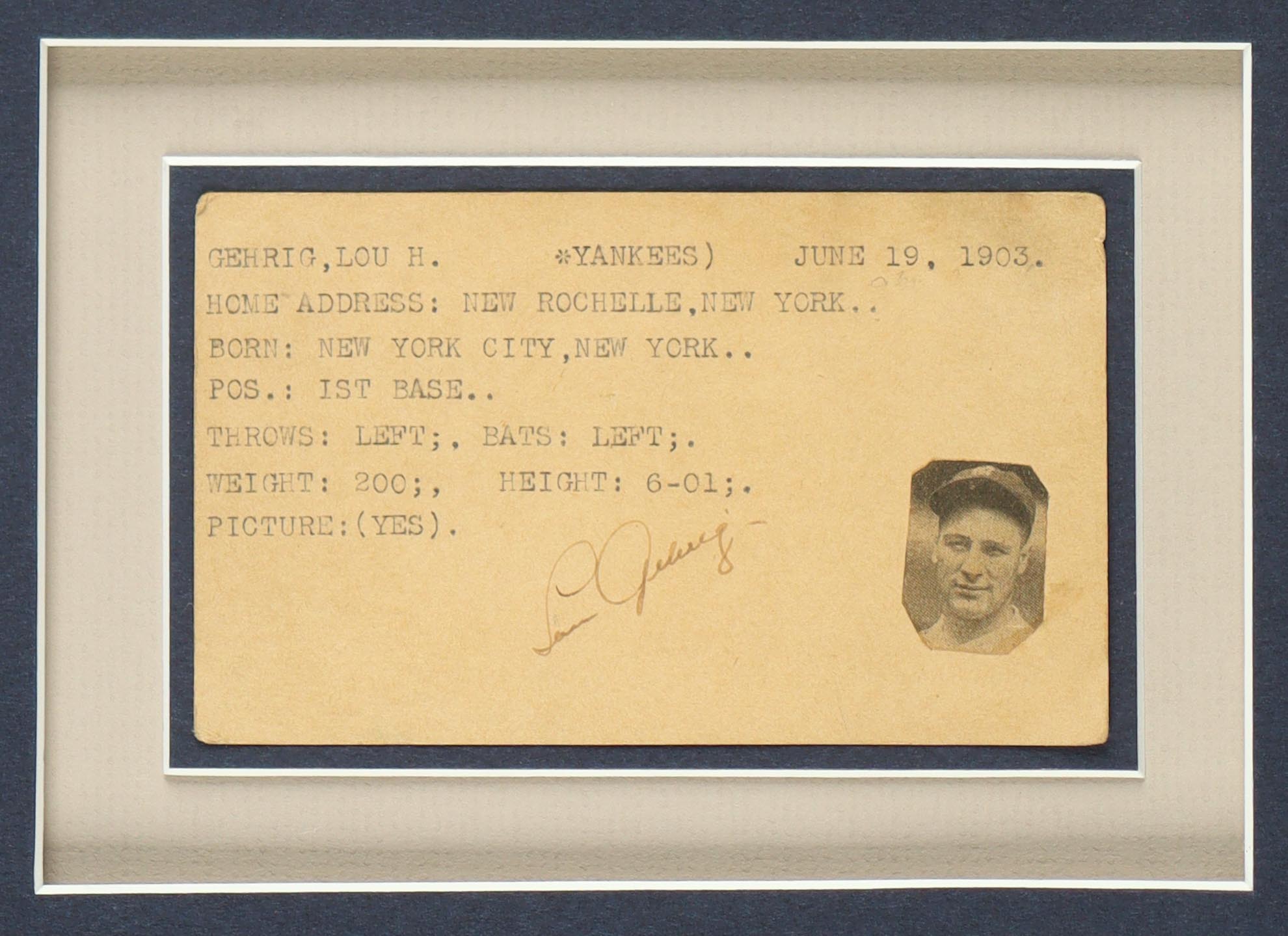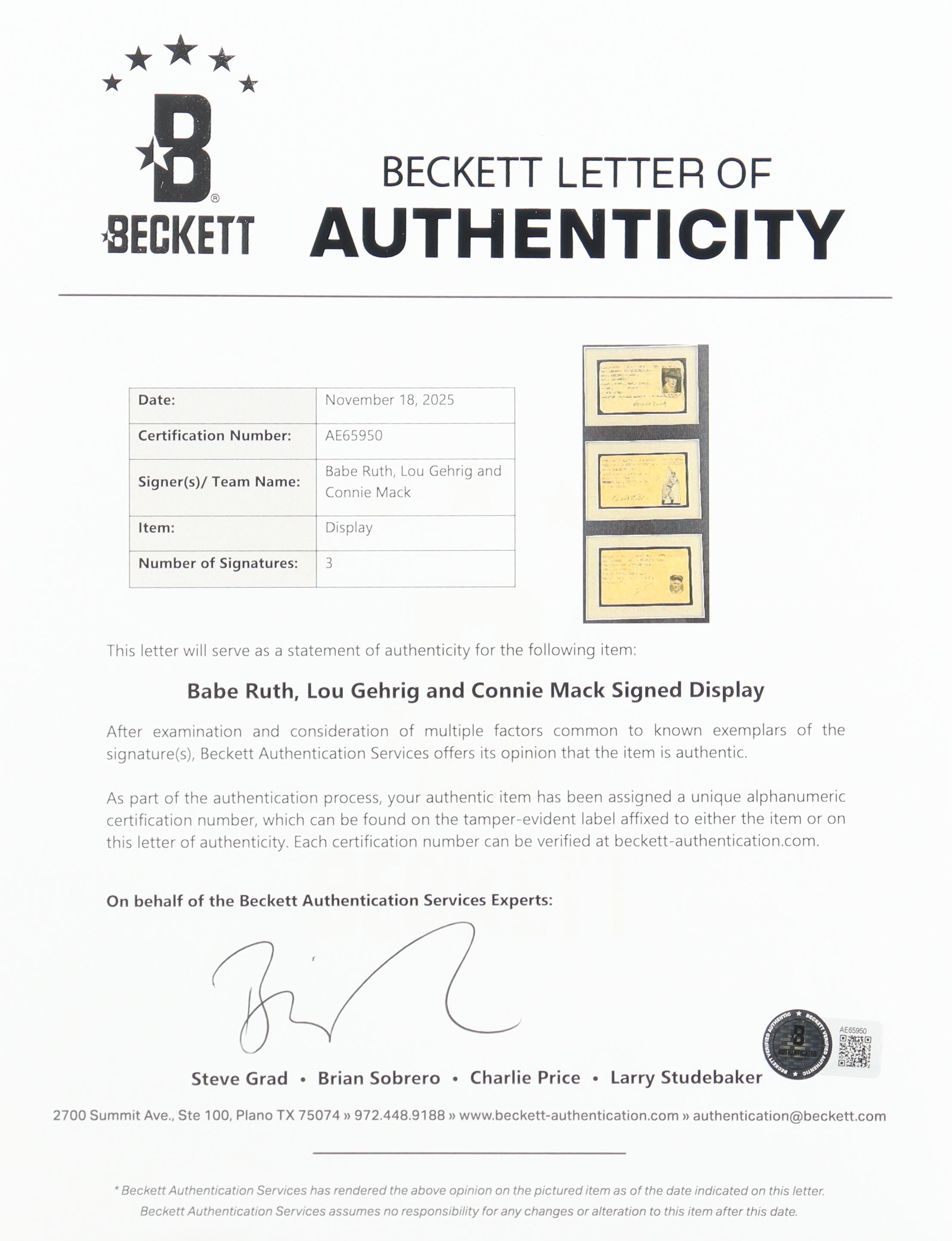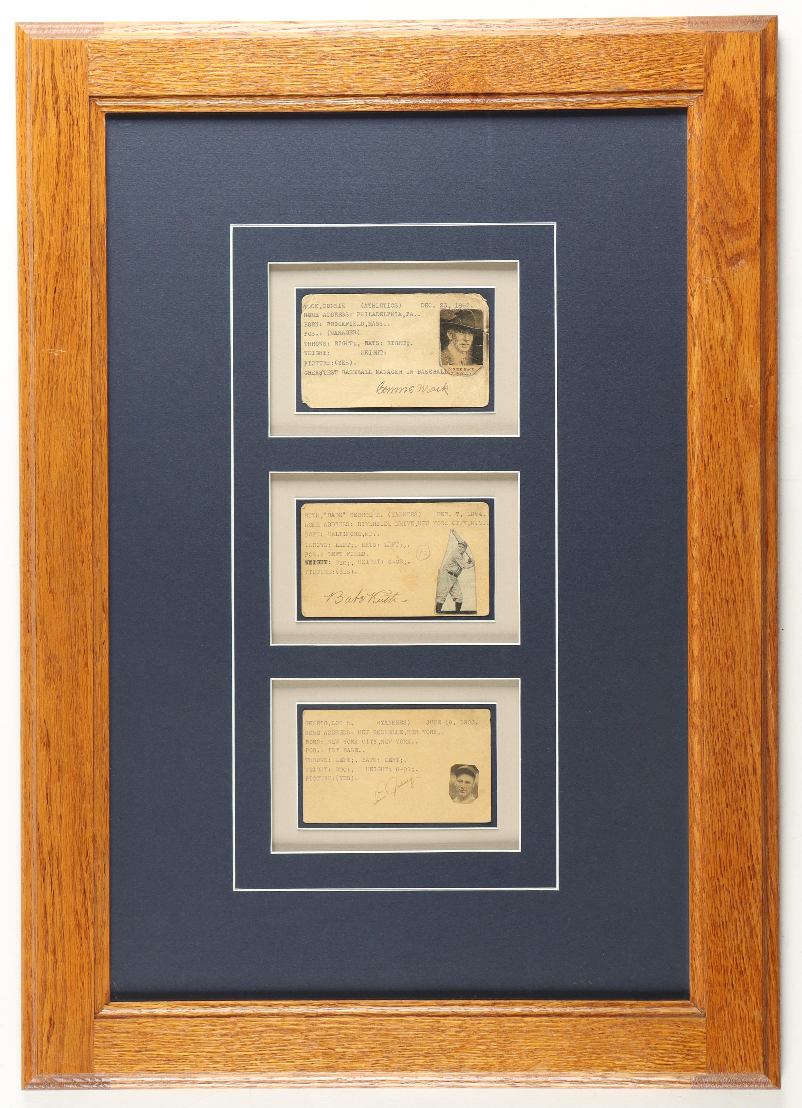 Custom frame measures 20" x 28" in size and features (3) individual cuts that have each been hand-signed by baseball legends Babe Ruth, Lou Gehrig and Connie Mack!