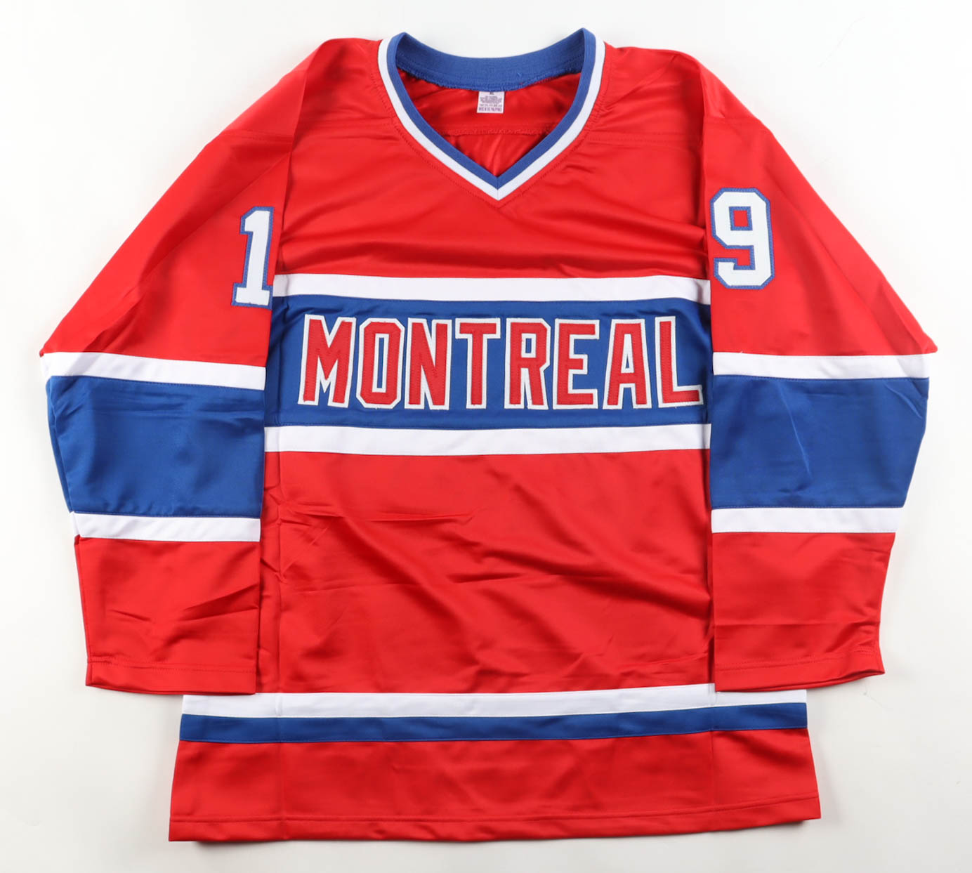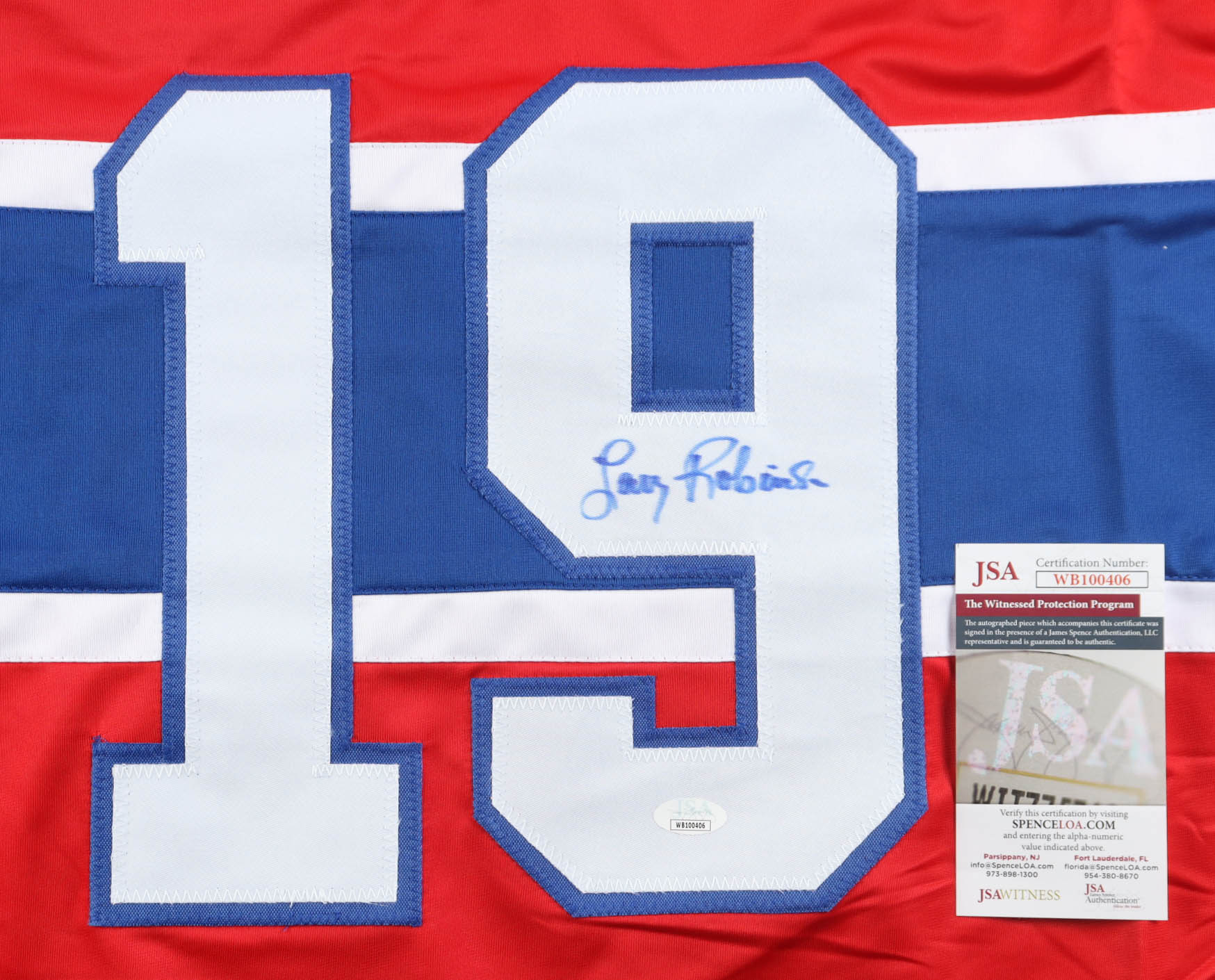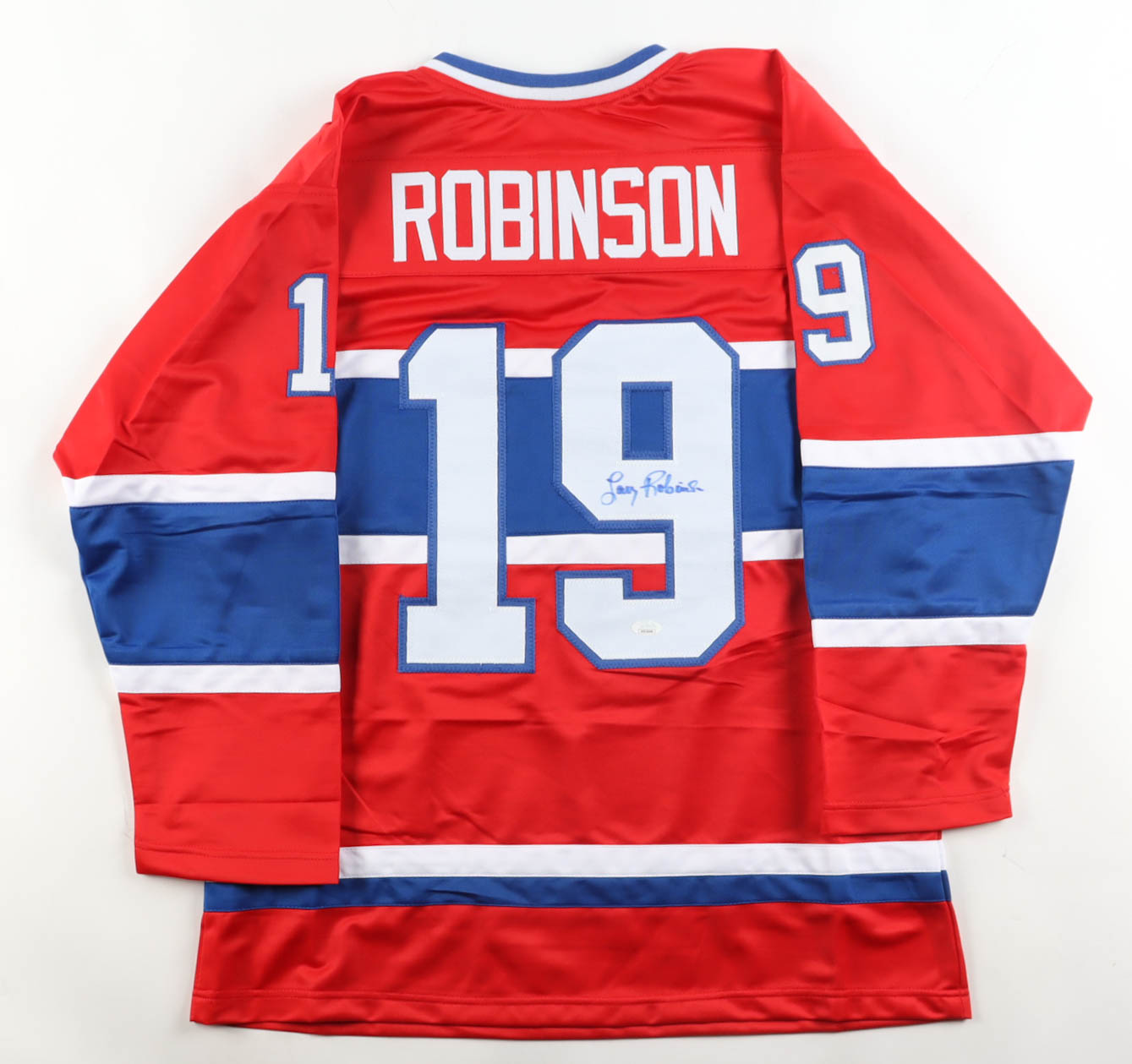 Custom jersey with everything sewn on, size XL. Hand-signed by Larry Robinson (HOF).