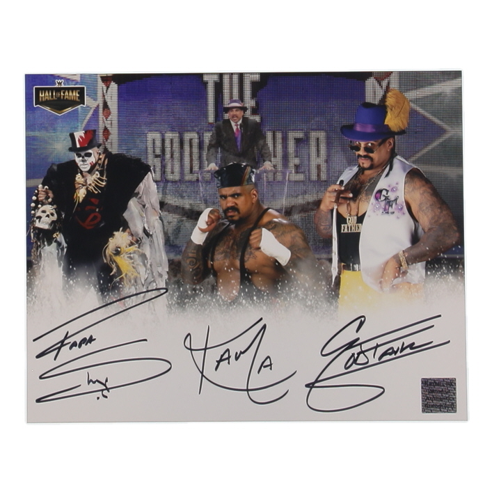 Photo measures 8" x 10" in size. Hand-signed by Charles Wright (HOF) as (3) of his in-ring personas: The Godfather, Papa Shango and Kama Mustafa.