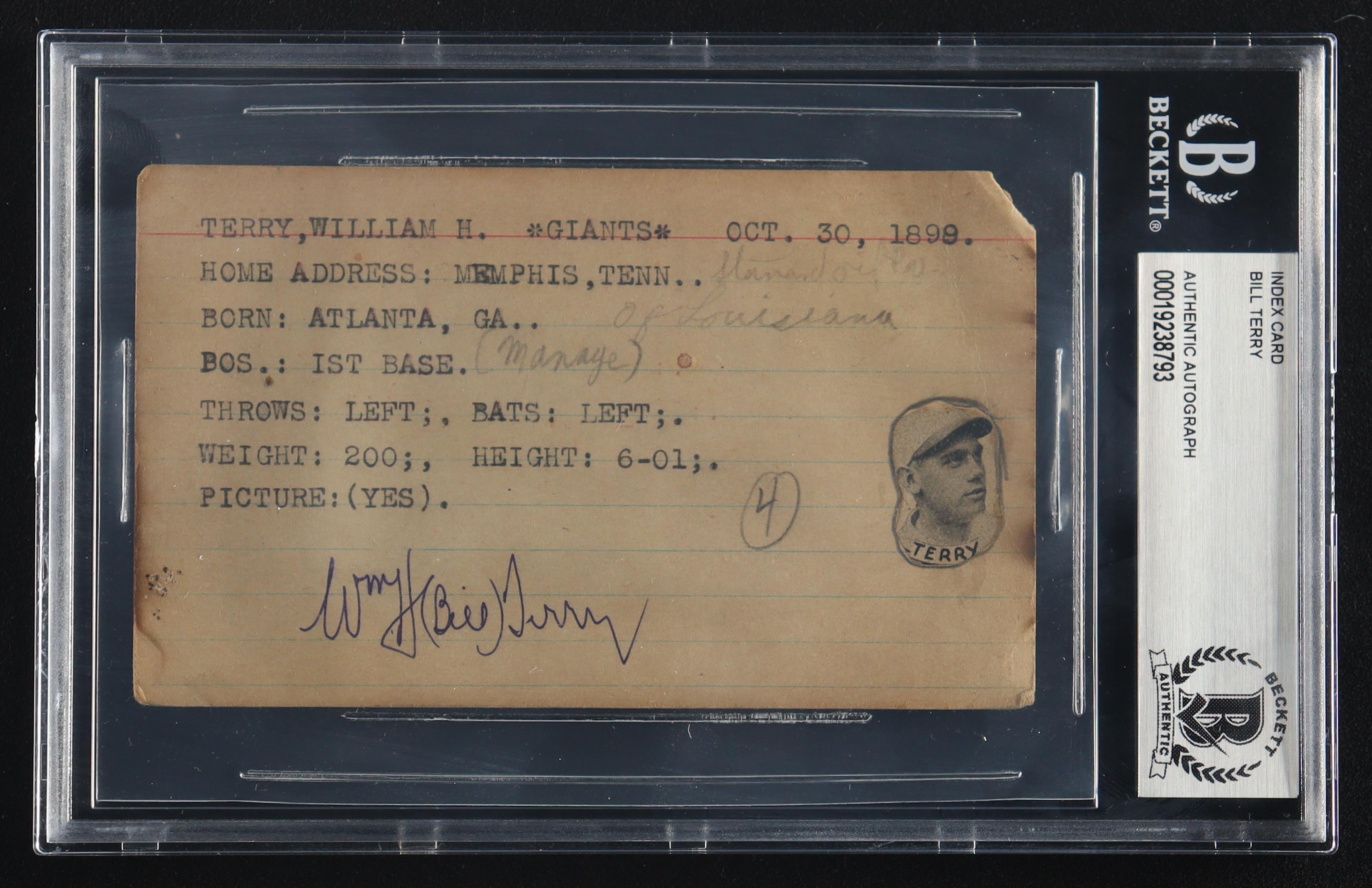Bill Terry Signed Vintage 3x5 Index Card (BGS)