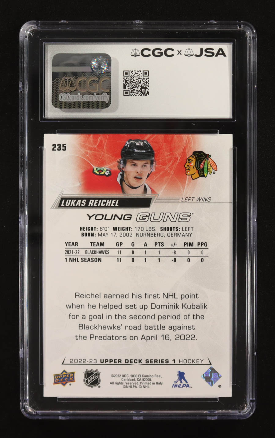 Lukas Reichel Signed 2022-23 Upper Deck #235 RC (CGC 9.5)