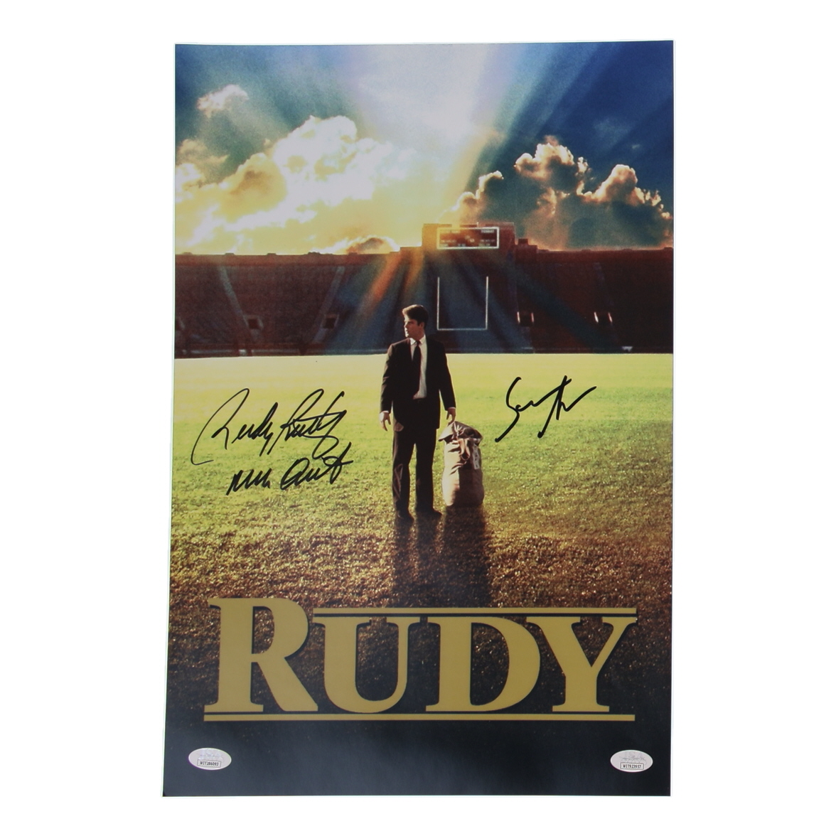 Photo measures 11" x 17" in size. Hand-signed and inscribed by Rudy Ruettiger (Notre Dame Fighting Irish) and Sean Astin.