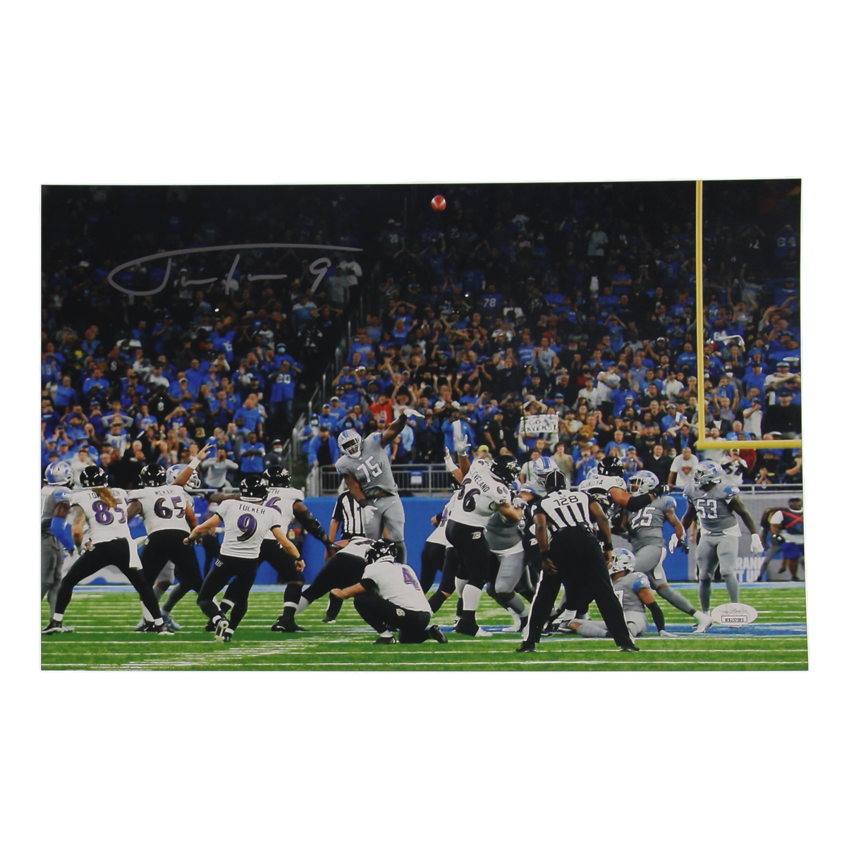 Photo measures 16" x 20" in size and has been hand-signed by Justin Tucker (Baltimore Ravens).
