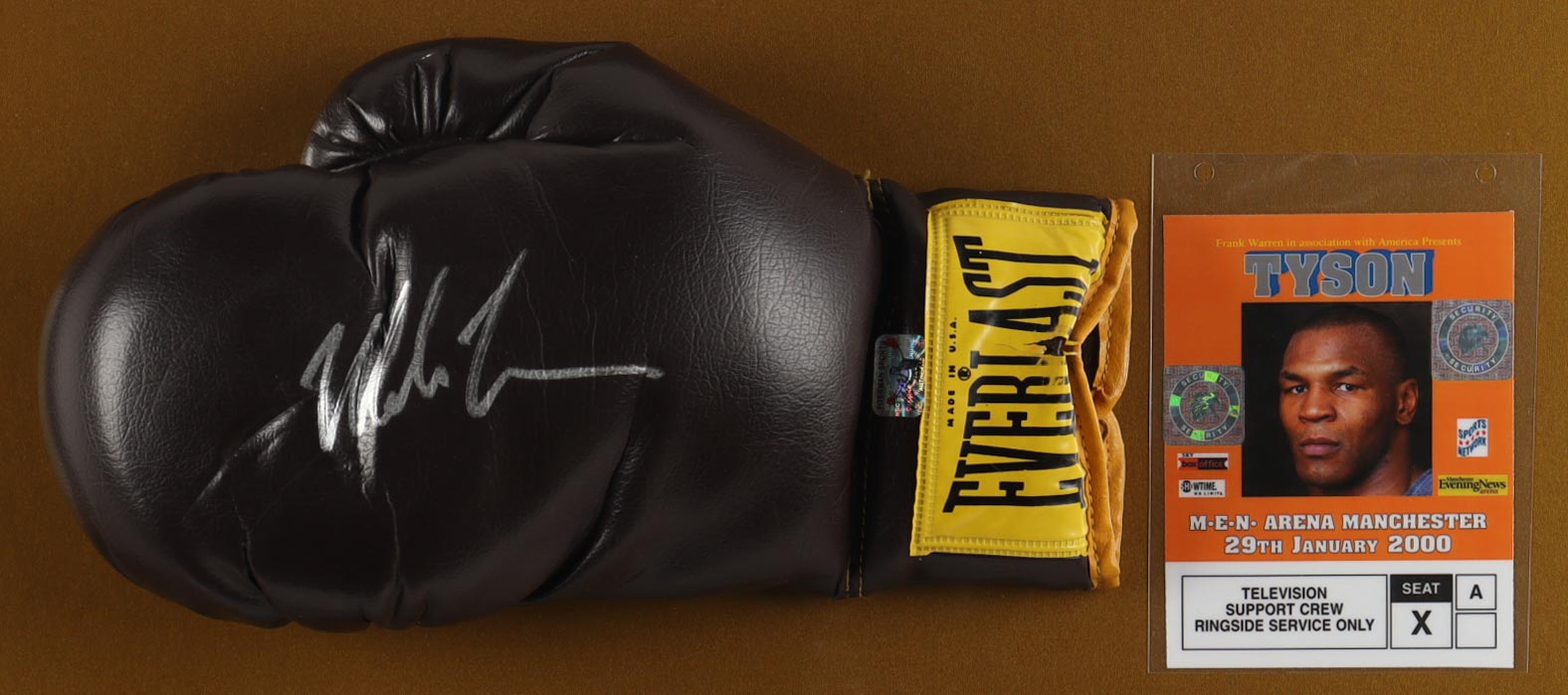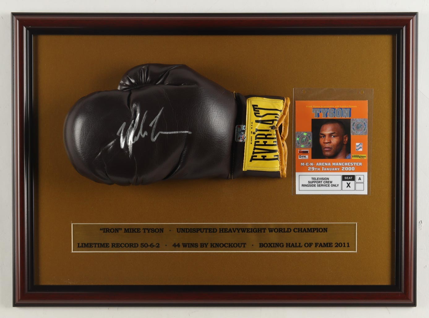 Custom frame measures approximately 16" x 22" in size and features a Vintage Everlast boxing glove that has been hand-signed by Mike Tyson (HOF). The display also includes an unsigned 2000 backstage pass.