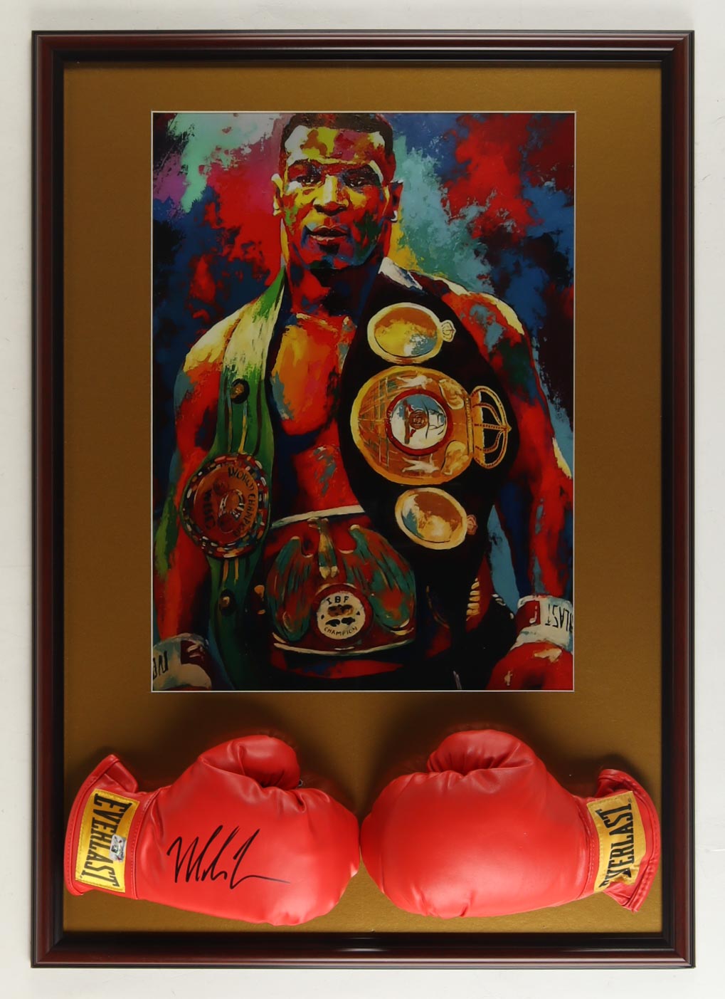 Custom frame measures 16" x 22" in size and features a (2) Everlast boxing gloves that have been hand-signed by Mike Tyson (HOF), as well as a Leroy Neiman (D. 2016) art print.