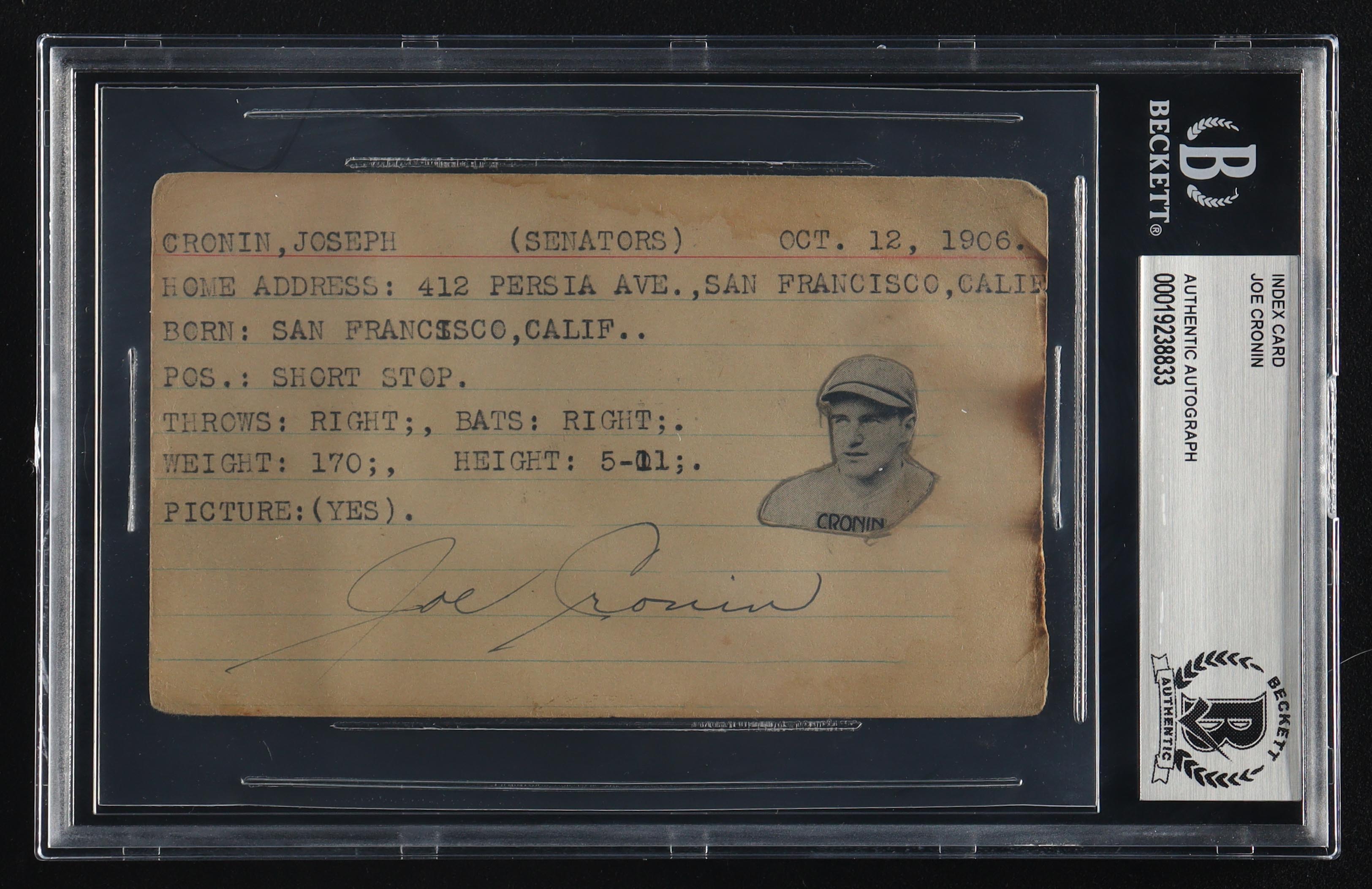 Joe Cronin Signed Vintage 3x5 Index Card (BGS)