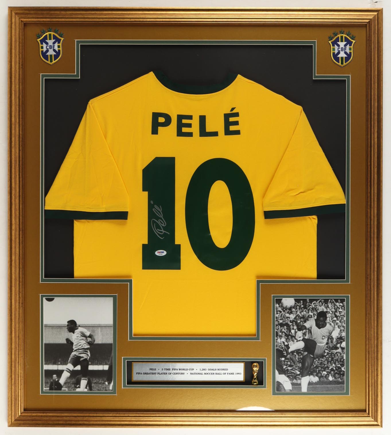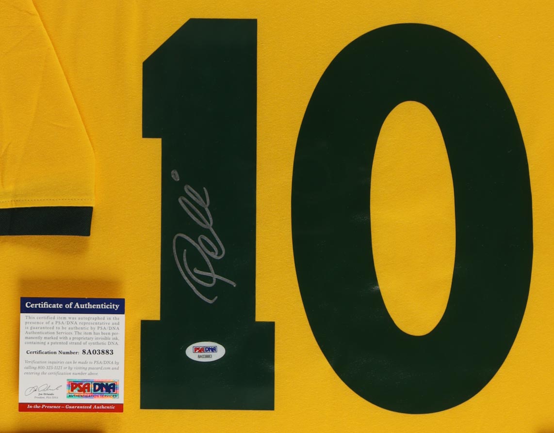 Custom frame measures 35" x 43" in size and features a jersey hand-signed by Pele (D. 2022, HOF). Please note that the 8" x 10" photos may be in reverse order. Display also features a Team Brazil Logo Pin and career statistics plaque.