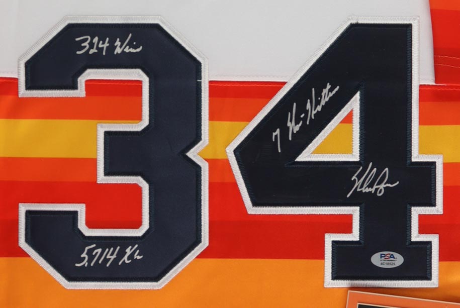 Nolan Ryan Signed Custom Framed Jersey Display Inscribed "324 Wins" & "5,714 K's" & "7 No-Hitters" with HOF Induction Pin (PSA)