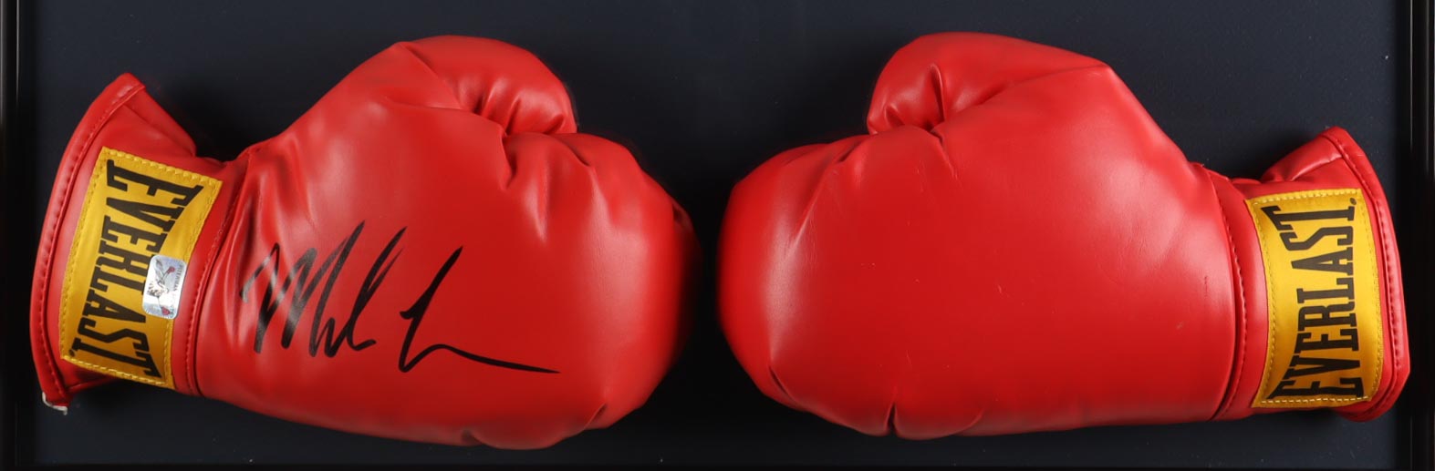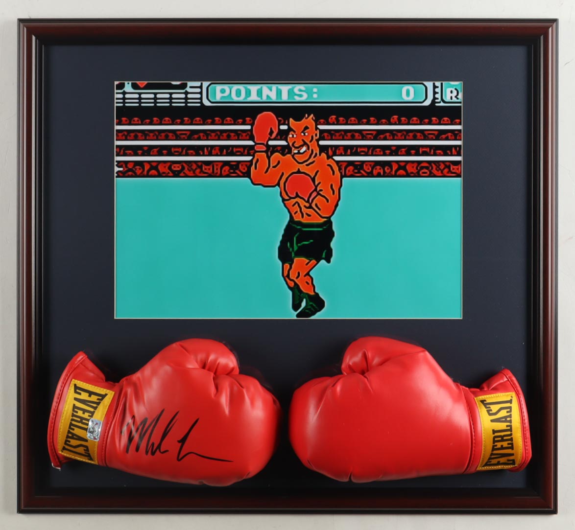 Custom frame measures approximately 22" x 24" in size and features a pair of Everlast boxing training gloves with one that has been hand-signed by Mike Tyson (HOF). Display also includes a Nintendo "Punch-Out" photo.