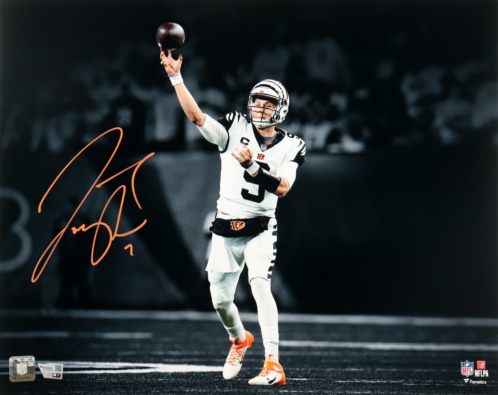 Photo measures 16" x 20" in size and has been hand-signed by Joe Burrow (Cincinnati Bengals).