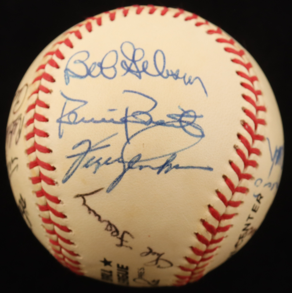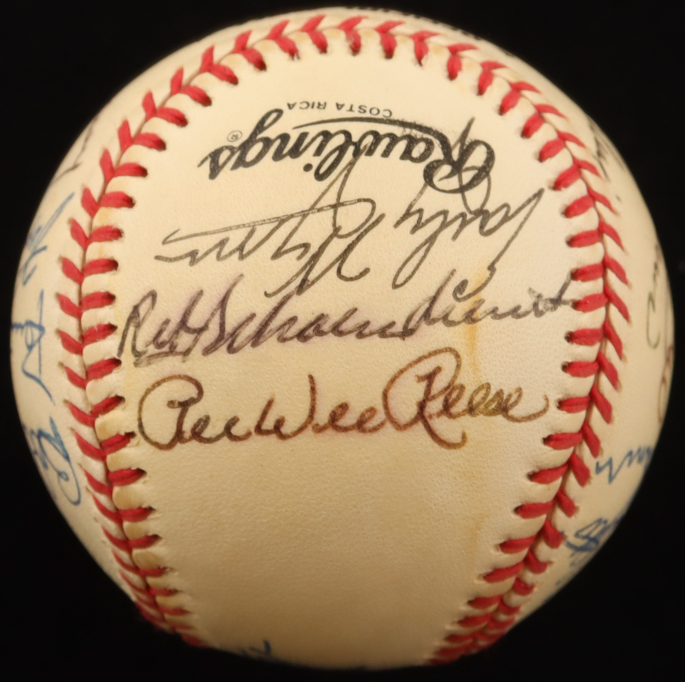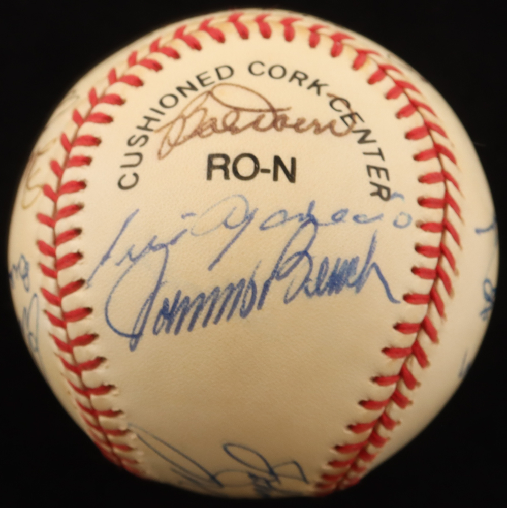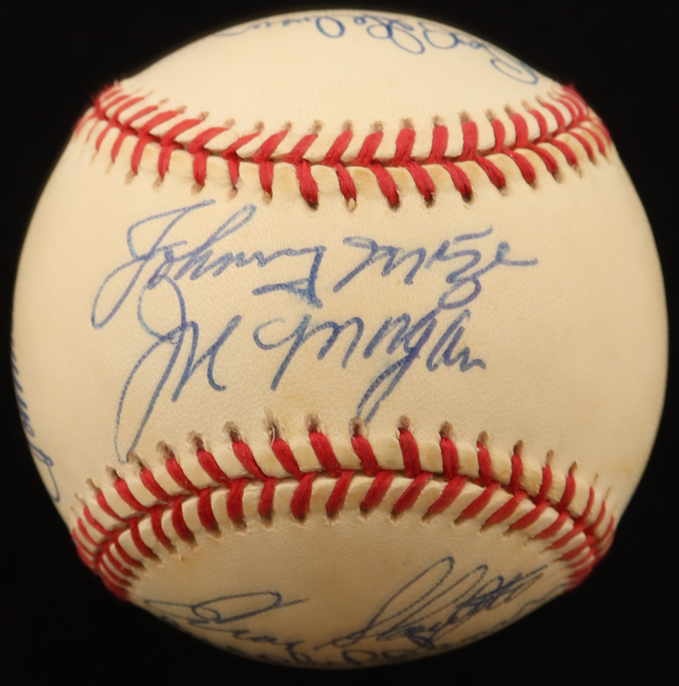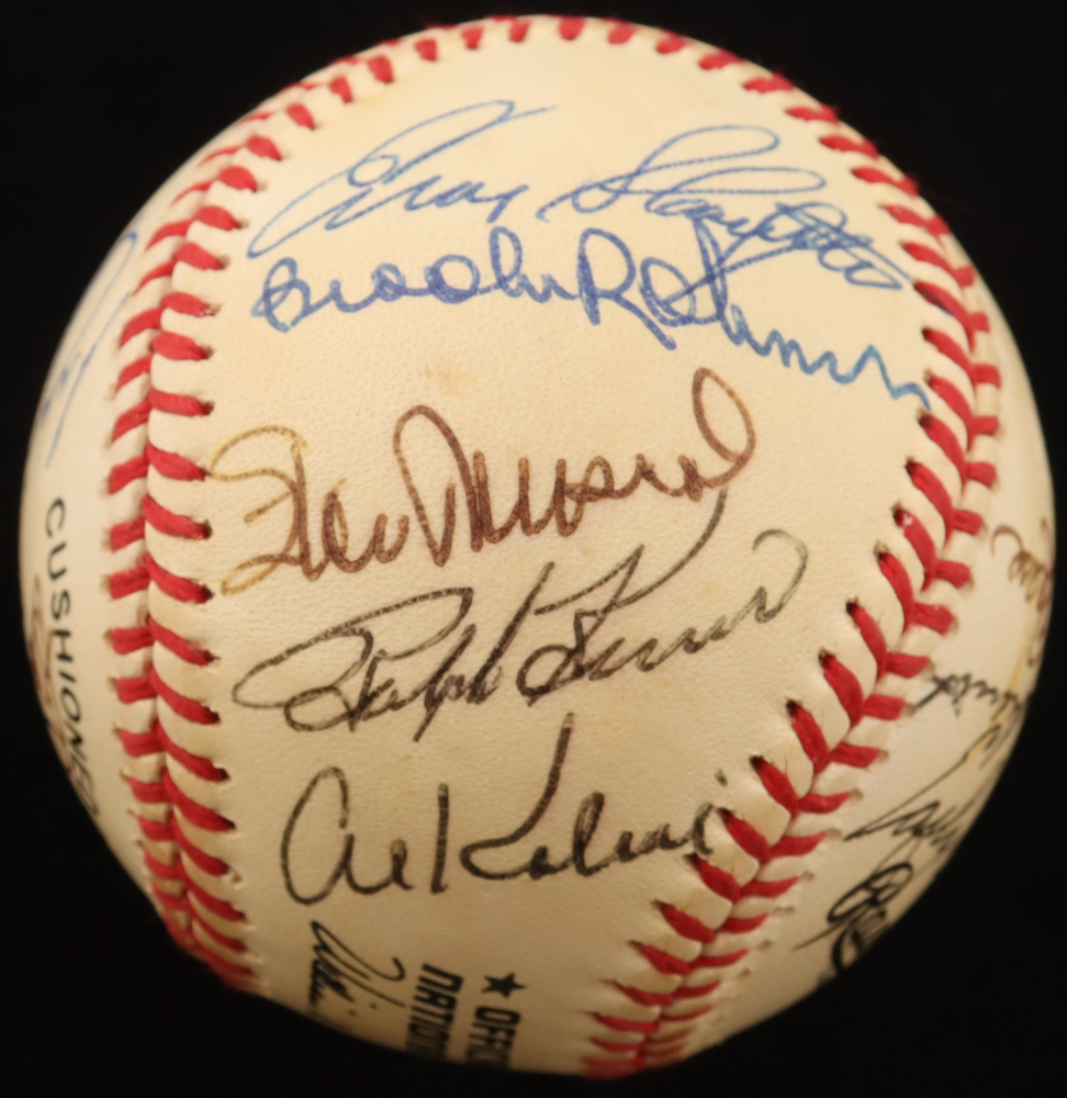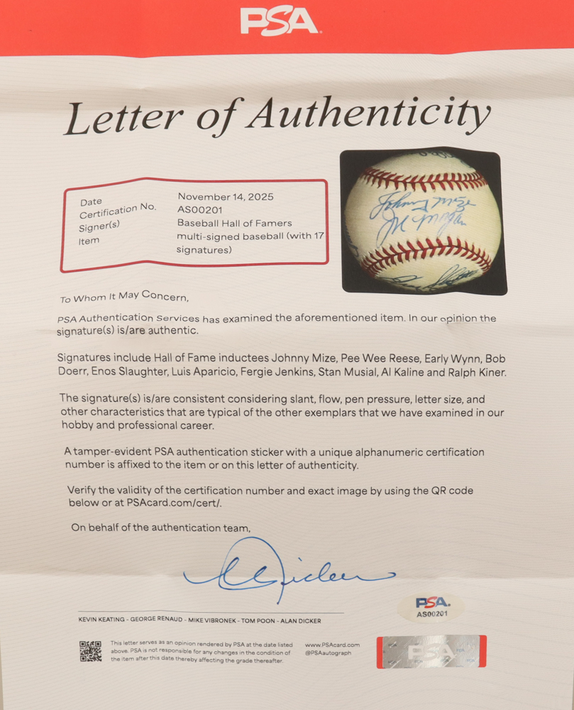 Baseball Hall of Famers Rawlings Official National League baseball. Hand-signed by (17) with Johnny Mize, Pee Wee Reese, Early Wynn, Bob Doer, Enos Slaughter, Luis Aparicio, Fergie Jenkins, Stan Musial, Al Kaline, Ralph Kiner, and (7) others. Display case included as shown. Refer to photos regarding the condition of the item.