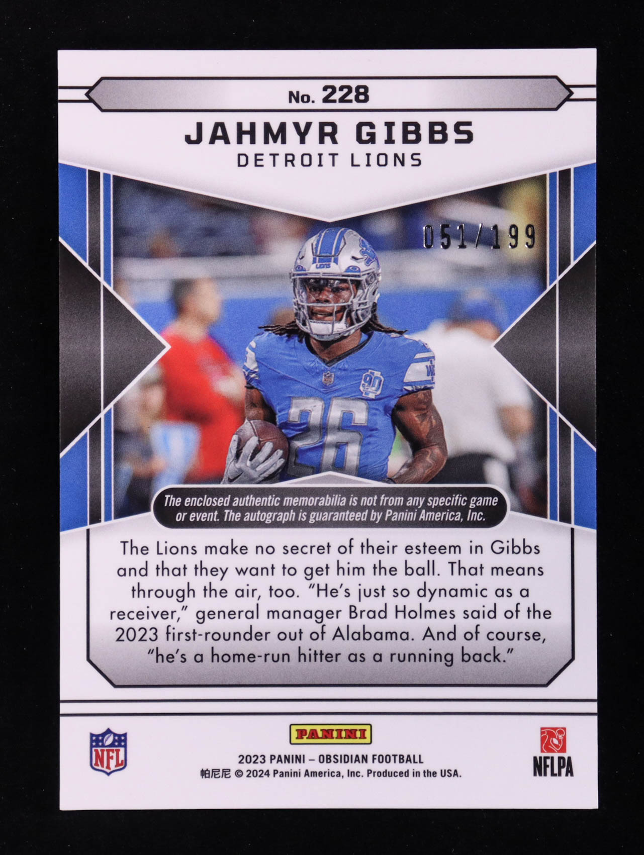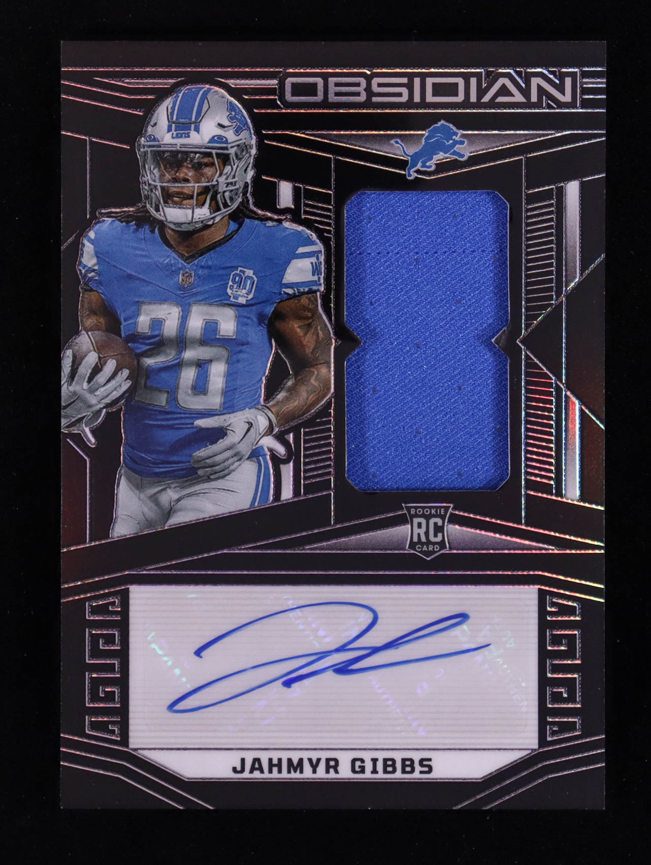 Jahmyr Gibbs 2023 Panini Obsidian Jersey Autographs #228 RC #051/199