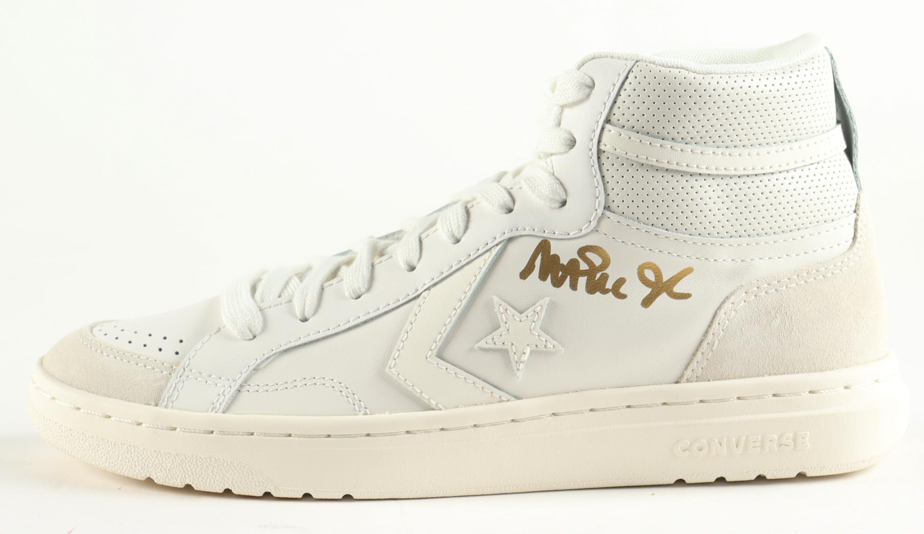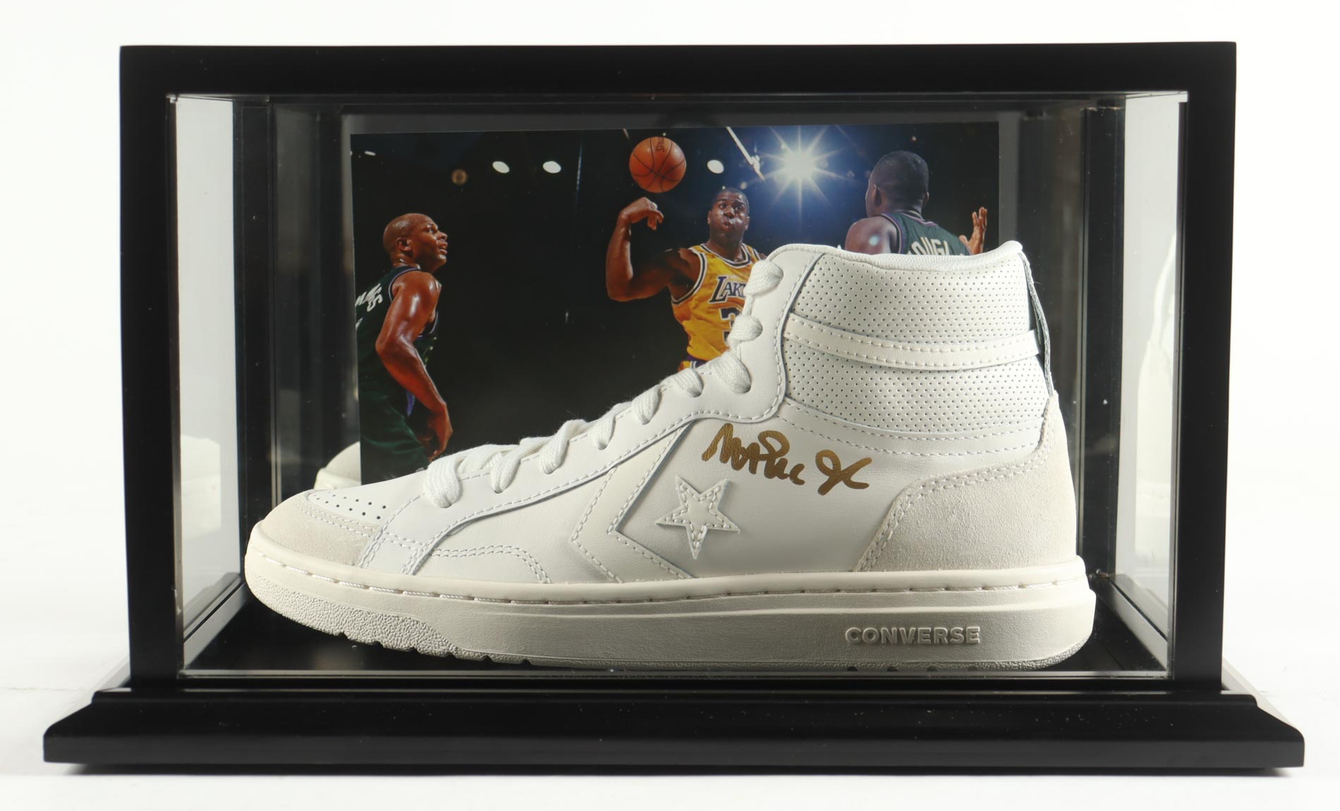 Converse All Star Weapon White Leather Basketball Shoe. Hand-signed by Magic Johnson (Los Angeles Lakers, HOF). The display case is included as shown.