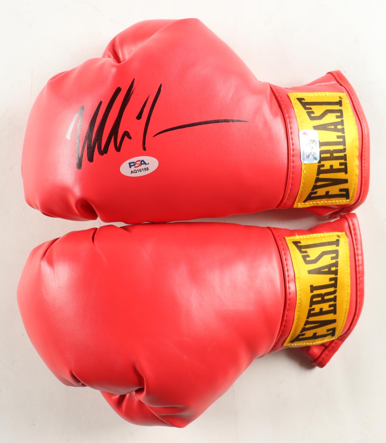 Pair of Everlast boxing gloves. The left glove has been hand-signed by Mike Tyson (HOF). Includes display case.