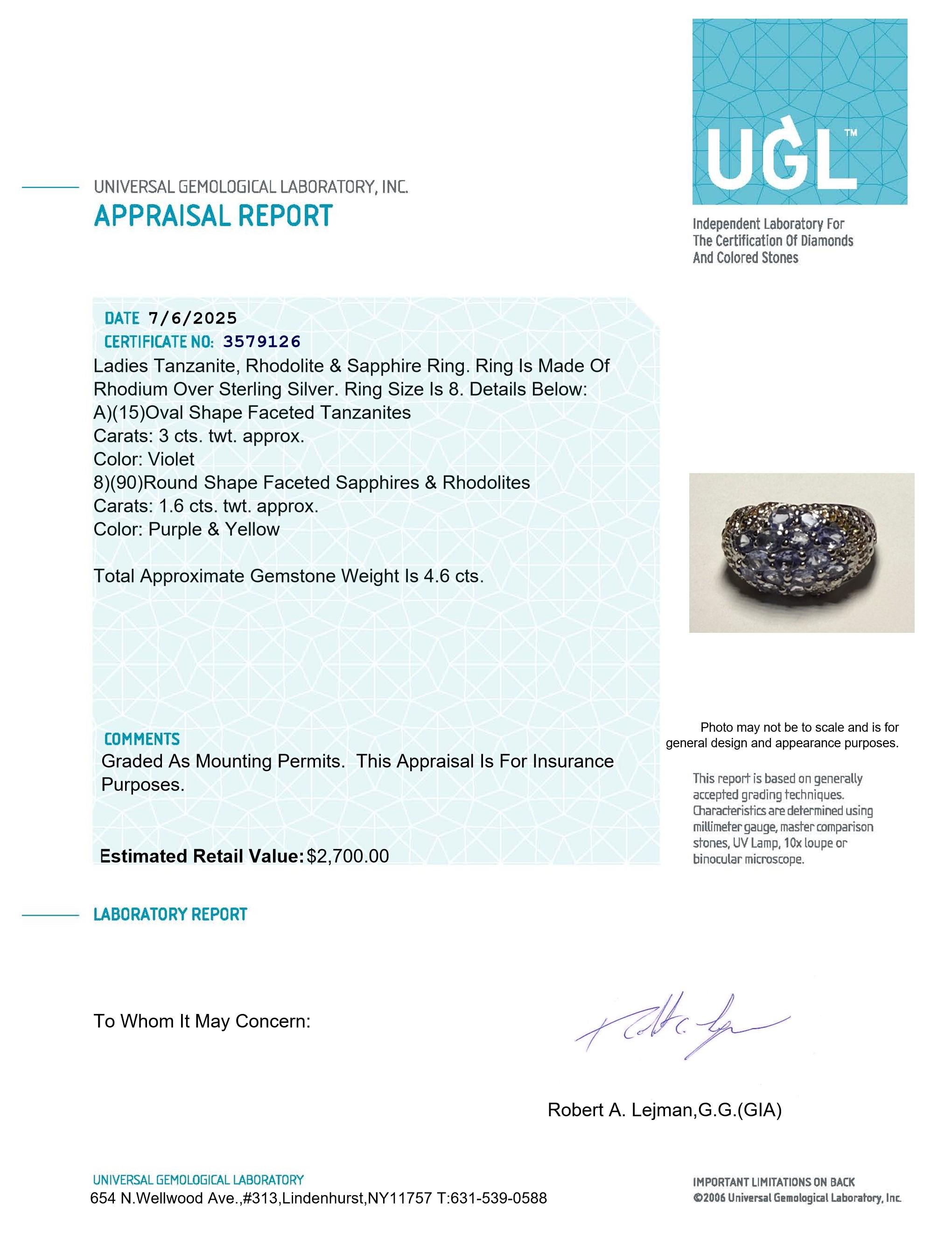 4.60 Carats Natural Tanzanite & Yellow Sapphire Ring | $2,700 Estimated Retail Value (UGL Cert)