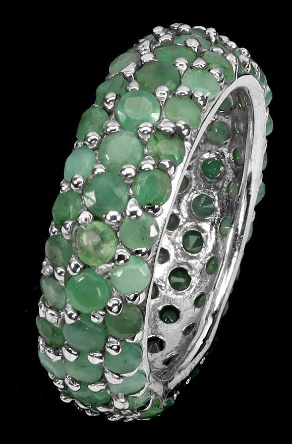 Offered for sale is a new ladies emerald three-row eternity ring set in rhodium over sterling silver. This ring features a continuous three-row design of vivid green round faceted emeralds, creating a bold and elegant look with strong finger coverage. The piece includes a professional appraisal for insurance purposes.