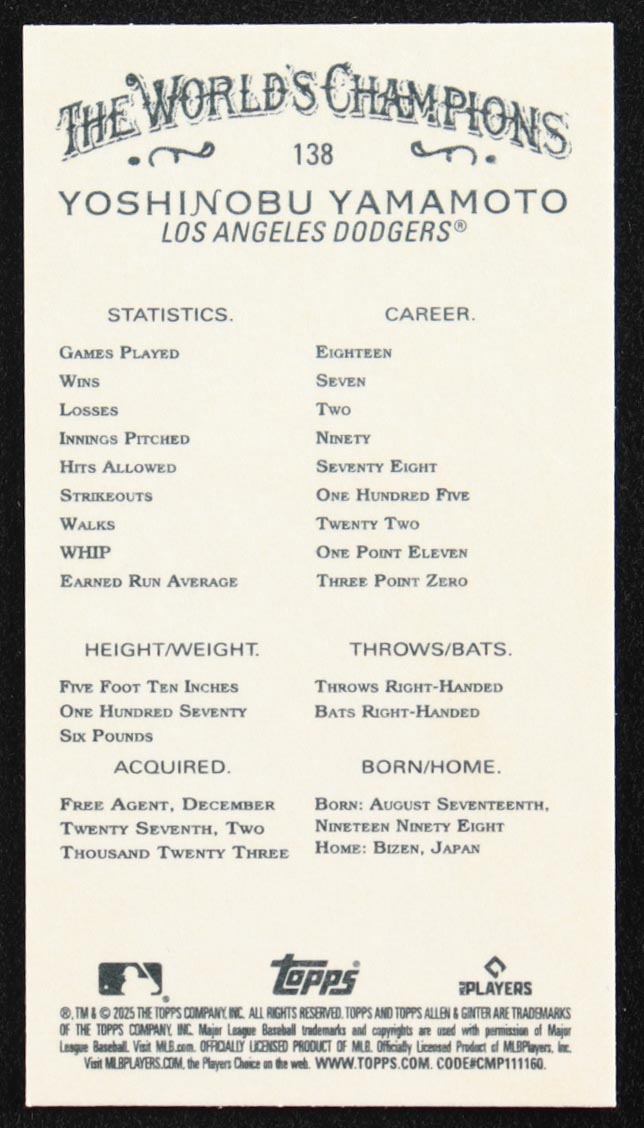 Yoshinobu Yamamoto 2025 Topps Allen and Ginter Mini #138