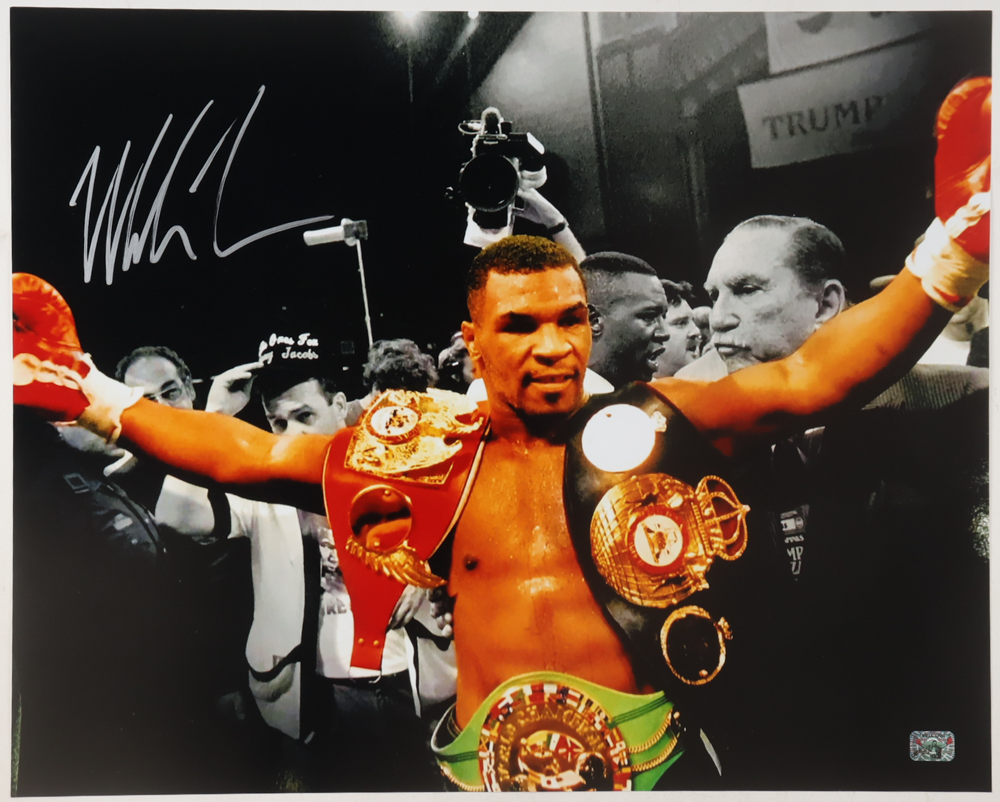 Photo measures approximately 16" x 20" in size. Hand-signed by Mike Tyson (HOF).
