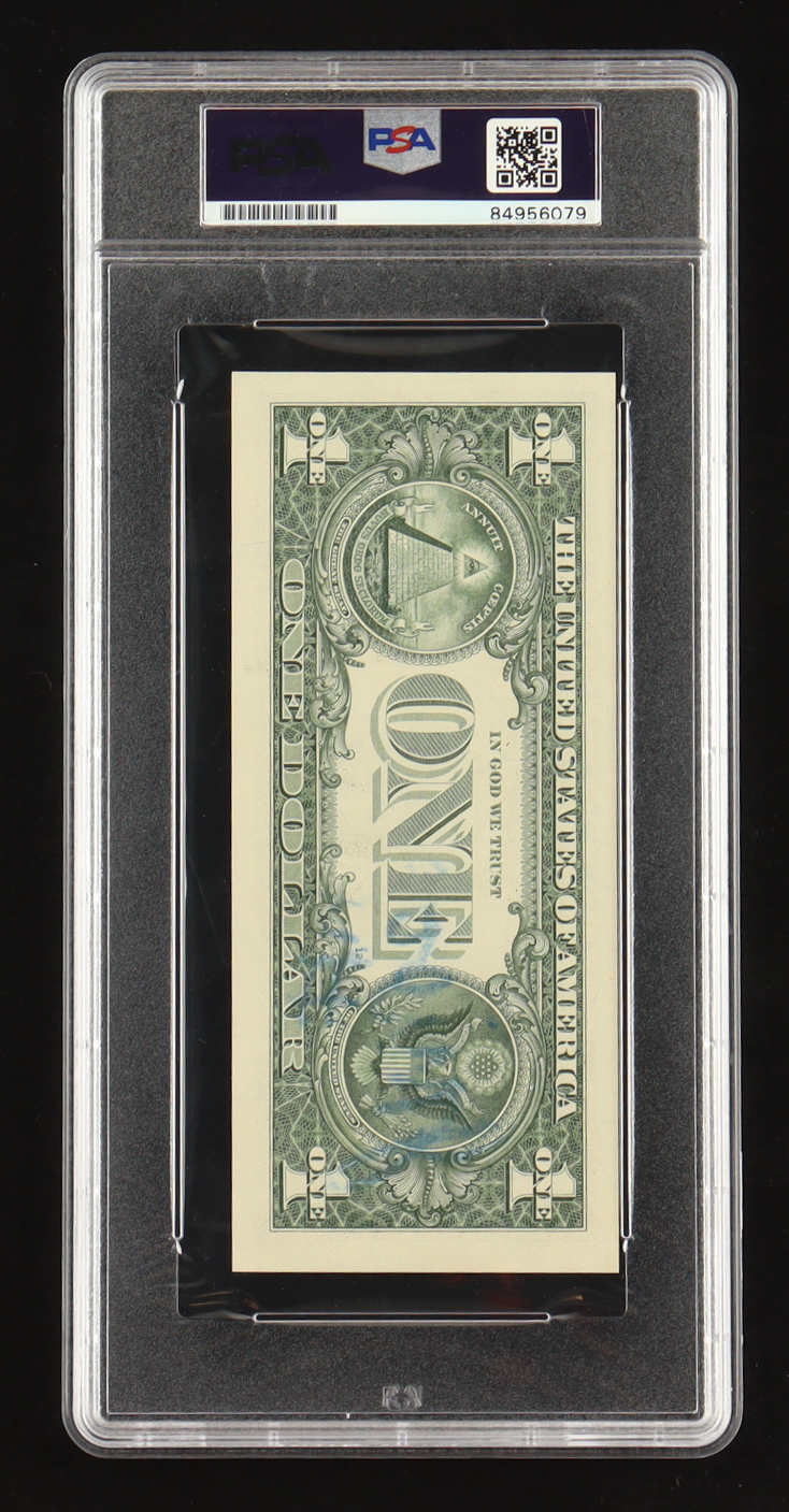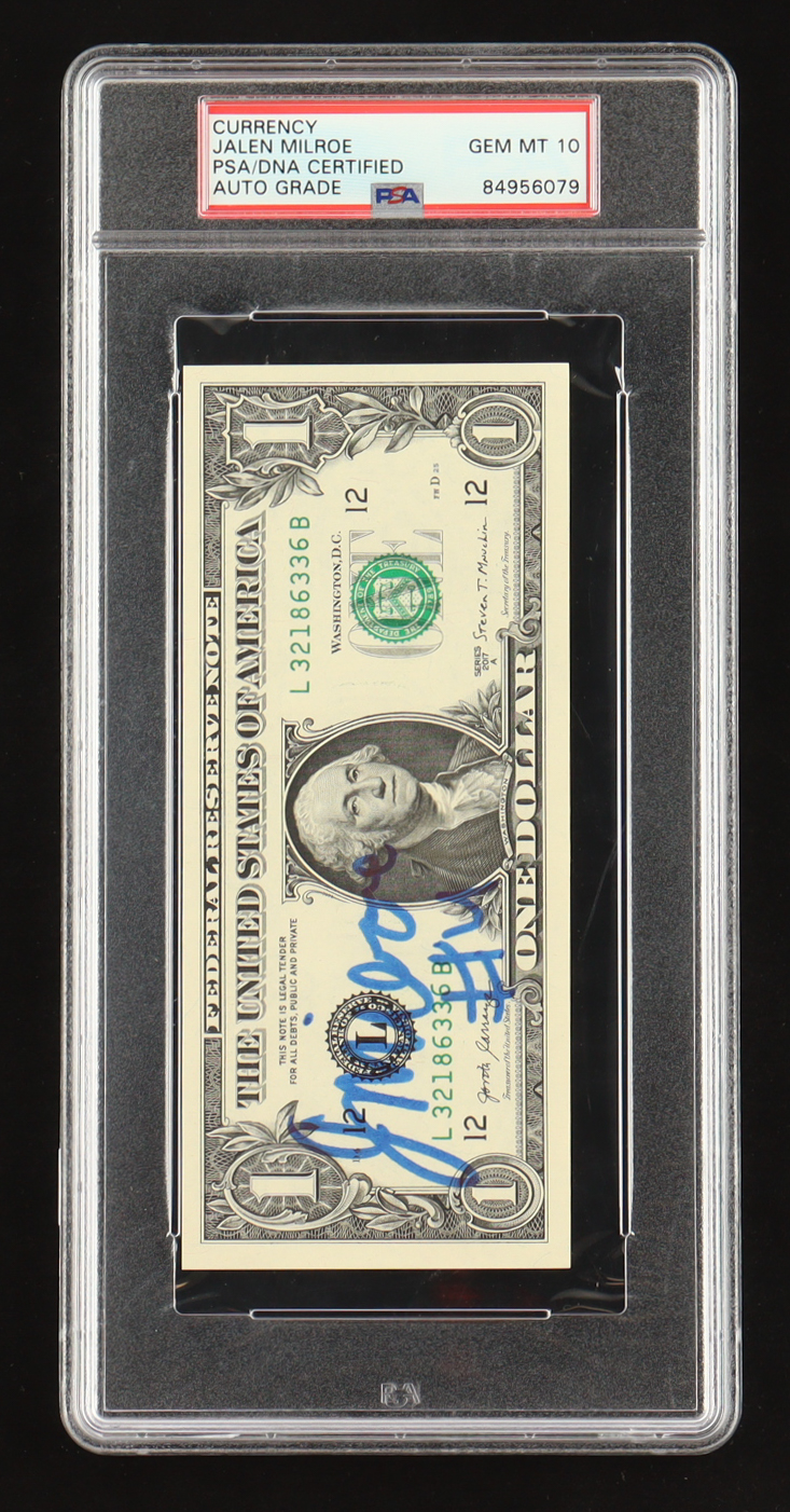 $1 One United States dollar has been hand-signed by Jalen Milroe (Seattle Seahawks). Autograph has been graded (PSA Gem Mint 10).