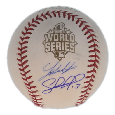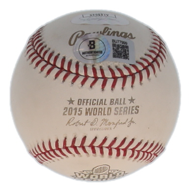 Rawlings Official 2015 World Series logo baseball. Hand-signed by Salvador Perez and Johnny Cueto (Kansas City Royals).