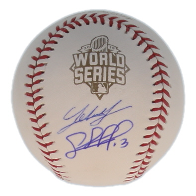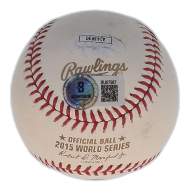 Rawlings Official 2015 World Series logo baseball. Hand-signed by Salvador Perez and Johnny Cueto (Kansas City Royals).