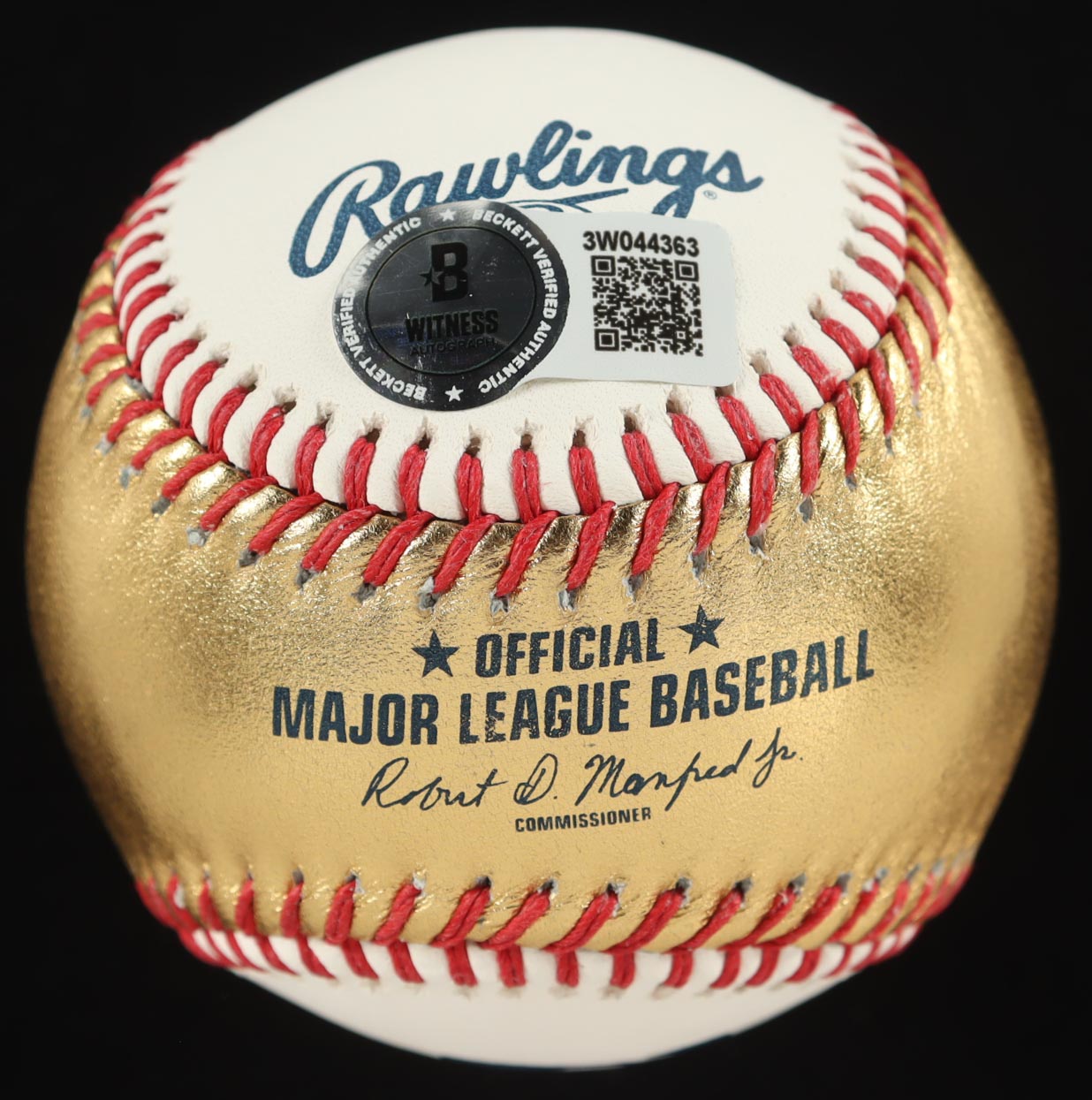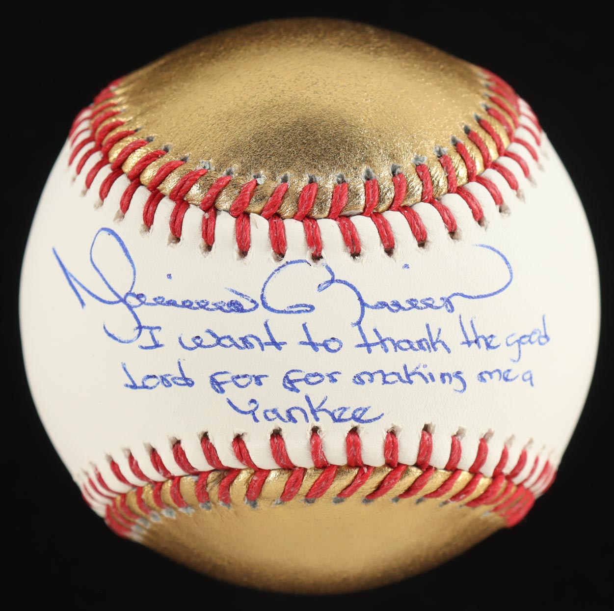 Rawlings Official Major League Gold Baseball. Hand-signed and inscribed by Mariano Rivera (New York Yankees, HOF). Please note, the display case is included in the listing as shown above.