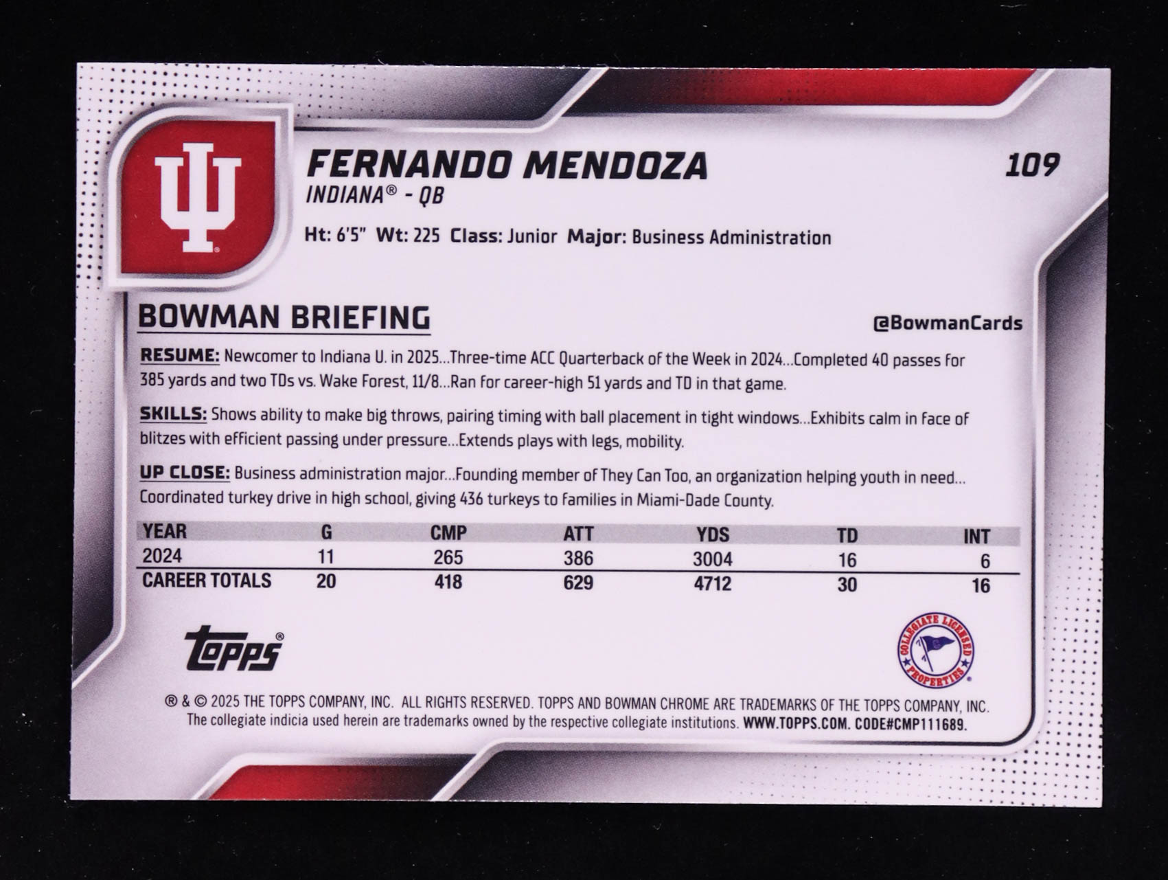 Fernando Mendoza 2025 Bowman Chrome University Shimmer Refractors #109 RC