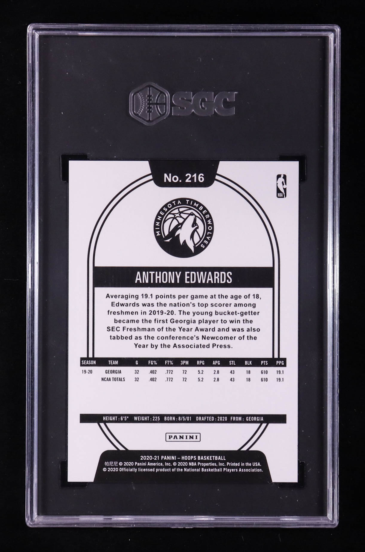 Anthony Edwards 2020-21 Hoops Premium Box Set #216 #066/199 RC (SGC 10)