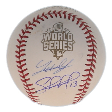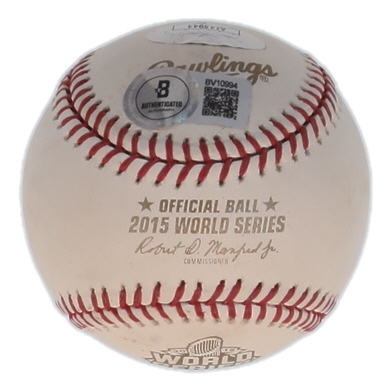 Rawlings Official 2015 World Series logo baseball. Hand-signed by Salvador Perez and Johnny Cueto (Kansas City Royals).