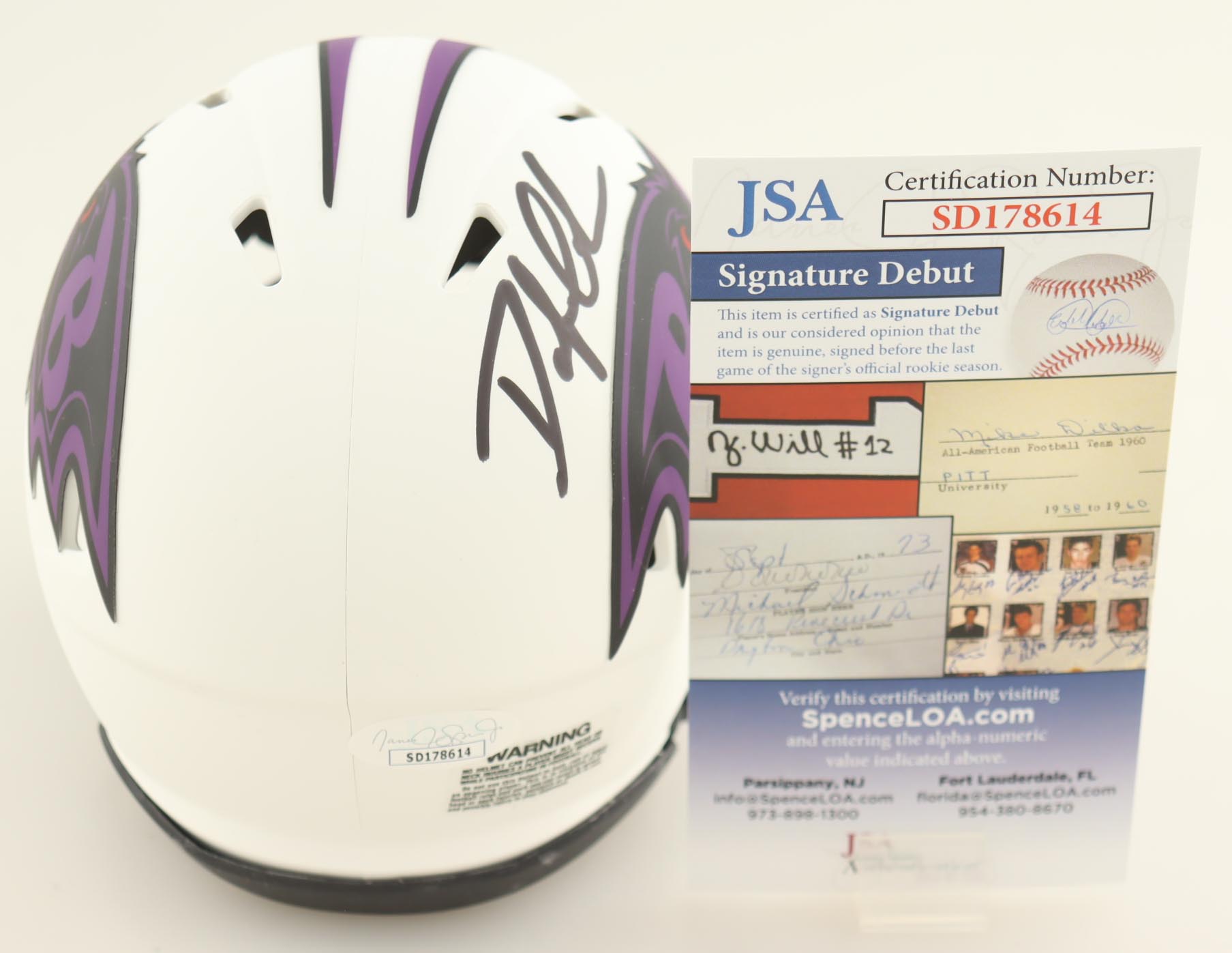The autograph(s) includes an official James Spence Authentication (JSA) "Signature Debut" hologram and COA. "Signature Debut" is the autographed memorabilia equivalent to a rookie card. The JSA definition of a "Signature Debut" is as follows: "Any item that is autographed and received by JSA prior to the last game of the signer's official rookie season.