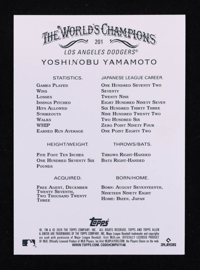 Yoshinobu Yamamoto 2024 Topps Allen and Ginter Chrome #201 RC