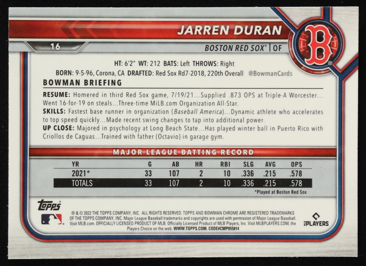 Jarren Duran 2022 Bowman Chrome #16 RC