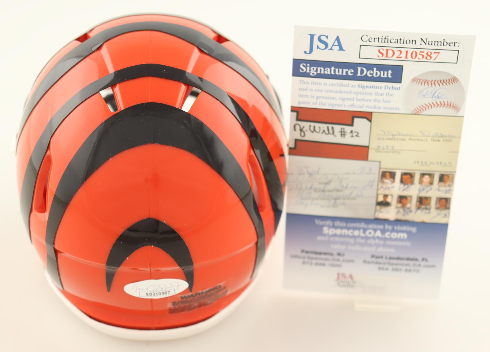The autograph(s) includes an official James Spence Authentication (JSA) "Signature Debut" hologram. "Signature Debut" is the autographed memorabilia equivalent to a rookie card. The JSA definition of a "Signature Debut" is as follows: "Any item that is autographed and received by JSA prior to the last game of the signer's official rookie season.