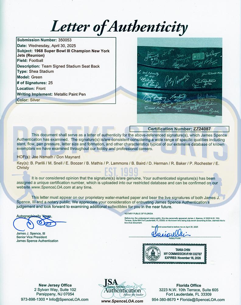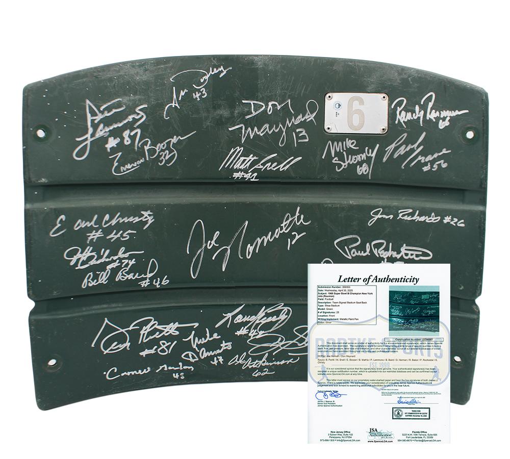 Shea Stadium Seatback has been hand-signed by (25) members of the 1969 New York Jets! Signers include Joe Namath, Don Maynard, Babe Parilli, Matt Snell, Emerson Boozer, Bill Mathis, Pete Lammons, Bill Baird, Dave Herman, Ralph Baker, Paul Rochester and Earl Christy.